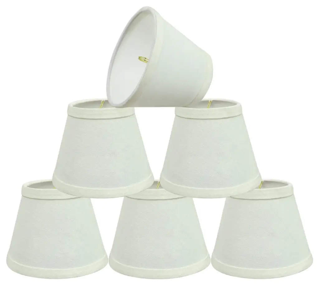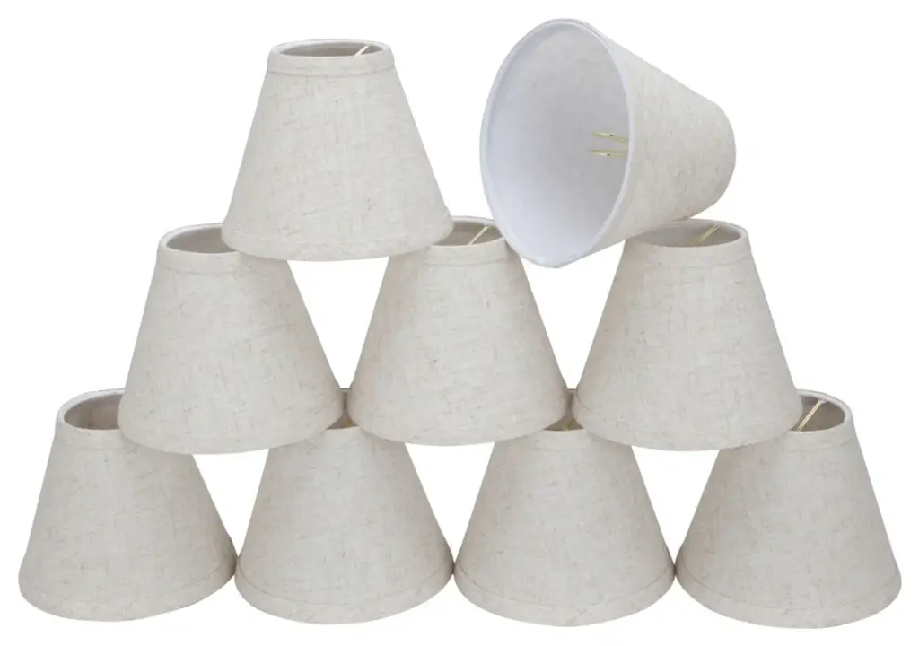 Urbanest pure linen hardback chandelier shade.This shade measures 3" across the top, 6" across the bottom, and 5" slant height.Hardback empire shape. Clip-on for candelabra bulbs. Maximum recommended wattage is 40 watts.Lining is white.List price is for six shades.