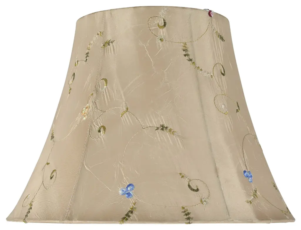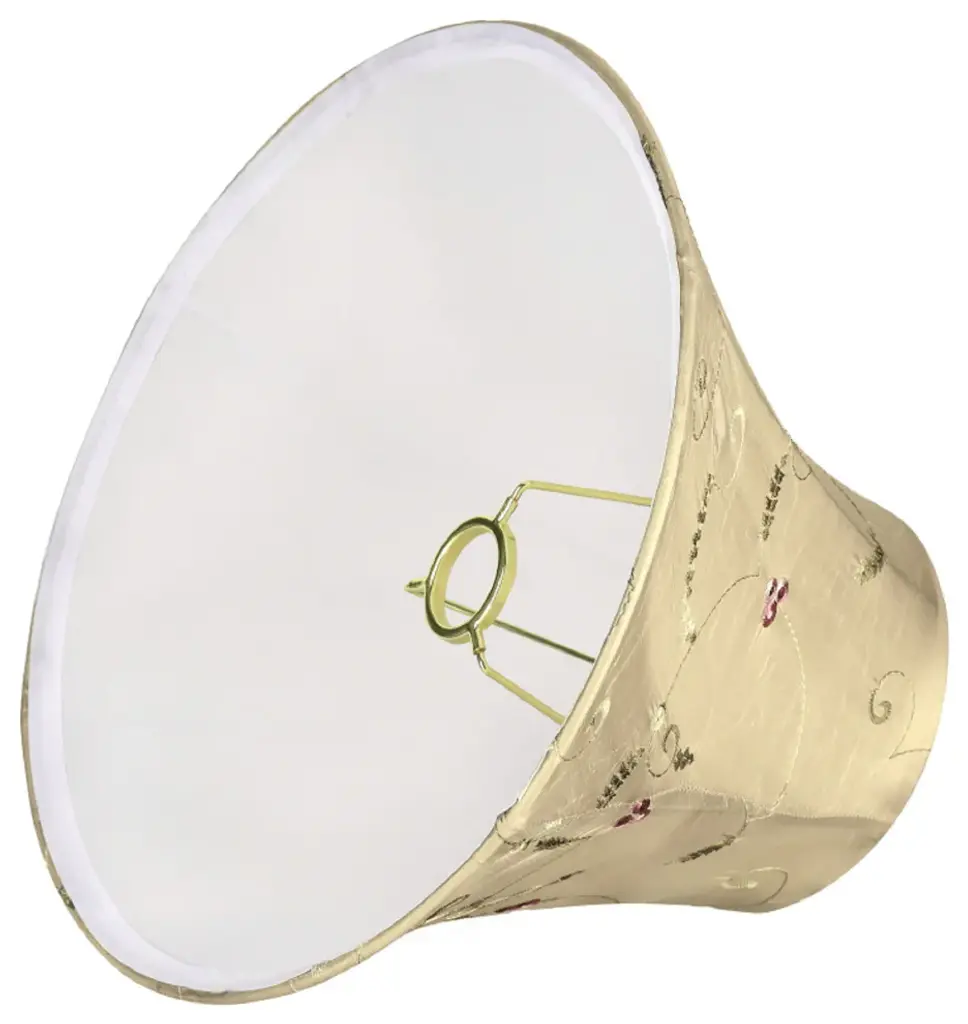 Aspen Creative is dedicated to offering a wide assortment of attractive and well-priced portable lamps, kitchen pendants, vanity wall fixtures, outdoor lighting fixtures, lamp shades, and lamp accessories. We have in-house designers that follow current trends and develop cool new products to meet those trends. Product Detail• 1 Pack transitional UNO bell replacement lamp shade• faux silk fabric in gold with floral embroidered design (flowers vary in color from item to item) | 6" Top x 13" bottom x 9" slant height• UNO lampshades fit only Phenolic threaded sockets that measure 1 3/8" wide (socket rings not included)• Applications: For Table Lamps, Accent lamps, Vintage Lamps, Candle Stick lamps and Kid''s Room Lamps