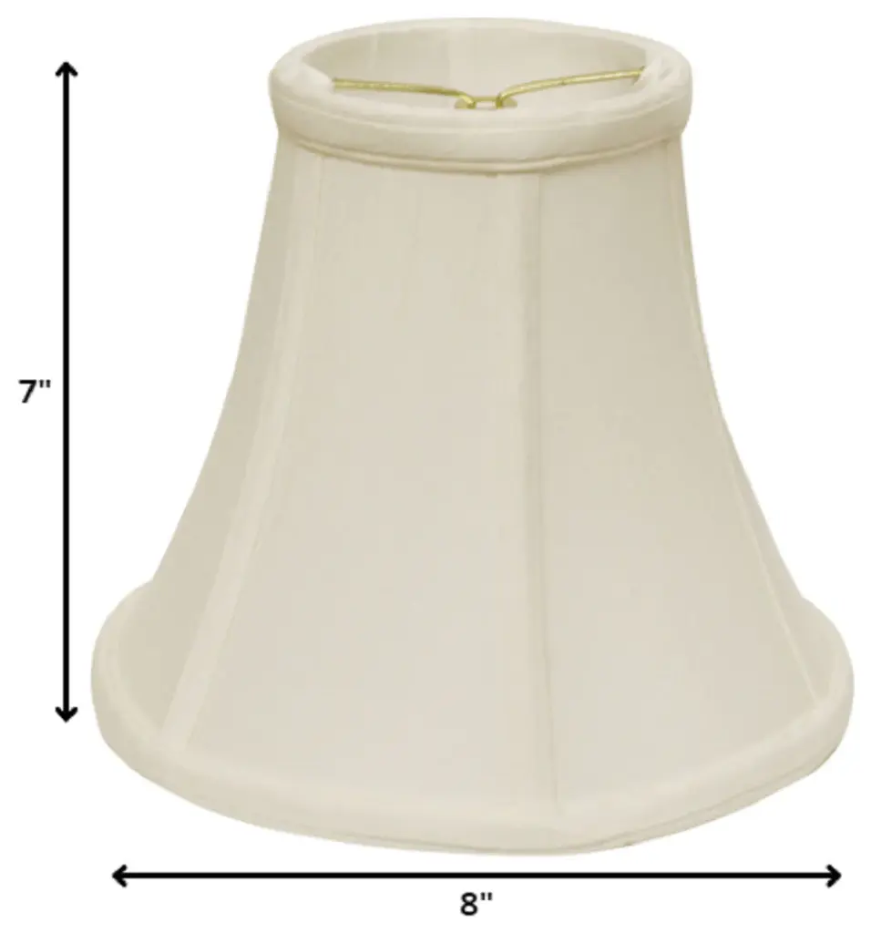 This White Premium Bell Monay Shantung Lampshade has a hint of traditional flair and will be a great addition to your lamp base. This softback lampshade includes a standard bulb clip that fits over a standard harp and can be used with your existing finial design. This high quality crafted bell shape has a slight slant to give it some visual interest and is crafted of the finest monay shantung with a fold on top and bottom of the shade. 7" x 8" x 8"