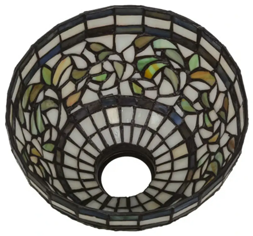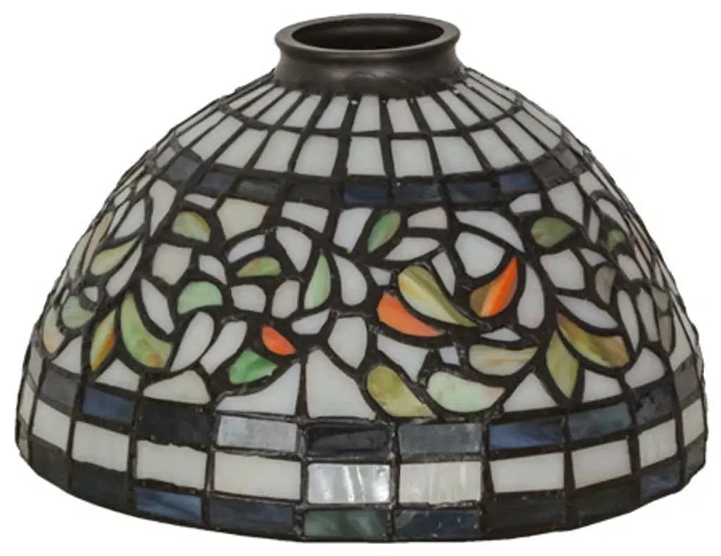 Subtle toned Autumn Gold; Russet and Moss Green leaves swirl against an Amber Mauve background in this stunning Tiffany Studio stained glass reproduction. The shade is enhanced with bands of Purple; Blue and Green and created using the famous Meyda Tiffany copperfoil construction process. This shade can be used with hardware to create a fine ceiling fixture or a base to make a handsome table lamp. Every Meyda Tiffany item is a unique handcrafted work of art. Natural variations in the glass colors make every item a masterpiece of its own.