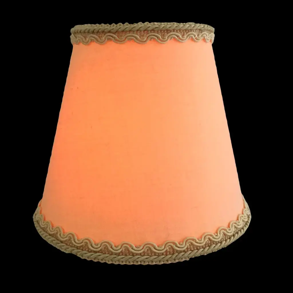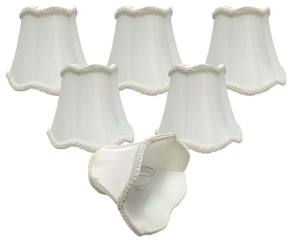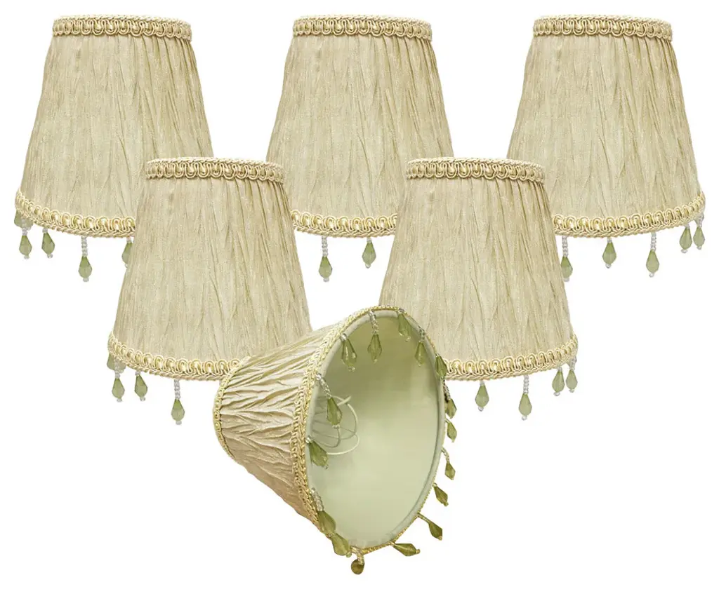 Royal Designs 5-Inch chandelier shades are handmade. You can use them for your chandeliers, wall sconces or small accent lamps. These lamp shades are highest quality and sure to bring a sense of style to any room.-Shade Dimensions: 3" x 5" x 4.5 (Top x Bottom x Height) -Shape: Empire Chandelier Lamp Shade with Designer Trim-Fabric: Hand Tailored Silk-Type Shantung Fabric, No Lining-Fitter: FLAME CLIP, FC, Fitter designed to fit over a Candelabra bulb base., Most clip-on lampshades are designed with double clip, . Suggested maximum wattage is 60-watt candelabra bulb.-Frame: Quality metal frame