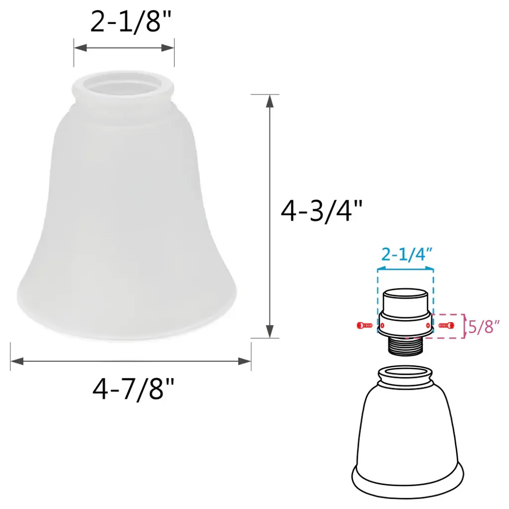Aspen Creative is dedicated to offering a wide assortment of attractive and well-priced portable lamps, kitchen pendants, vanity wall fixtures, outdoor lighting fixtures, lamp shades, and lamp accessories. We have in-house designers that follow current trends and develop cool new products to meet those trends. Product Detail• Aspen Creative bell shaped frosted replacement glass shade, 4 pack• 2-1/8" Fitter Size, 4-5/8" high x 4-3/4" diameter• Replacement glass for ceiling fan light kits that require a 2-1/8" fitter• Upgrade and / or change the look for your fixtures with an easy to glass change