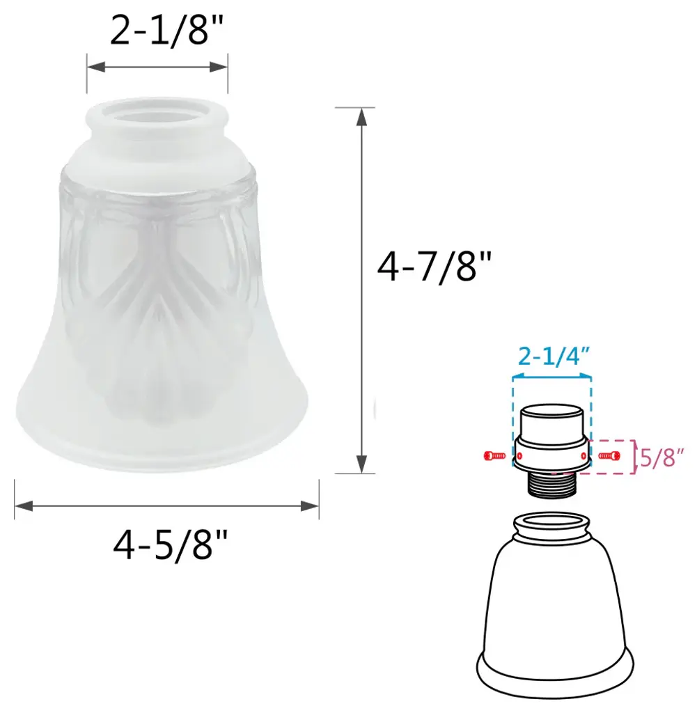 Aspen Creative is dedicated to offering a wide assortment of attractive and well-priced portable lamps, kitchen pendants, vanity wall fixtures, outdoor lighting fixtures, lamp shades, and lamp accessories. We have in-house designers that follow current trends and develop cool new products to meet those trends. Product Detail• Aspen Creative clear & frosted design replacement glass, 4 pack• 2-1/4" fitter size, 4-7/8" high x 4-5/8" diameter• Our replacement glass shades can be used on an assortment of ceiling fan light kit products that use a 2-1/4 inch fitter• Upgrade and / or change the look fo your fixtures with an easy to glass change