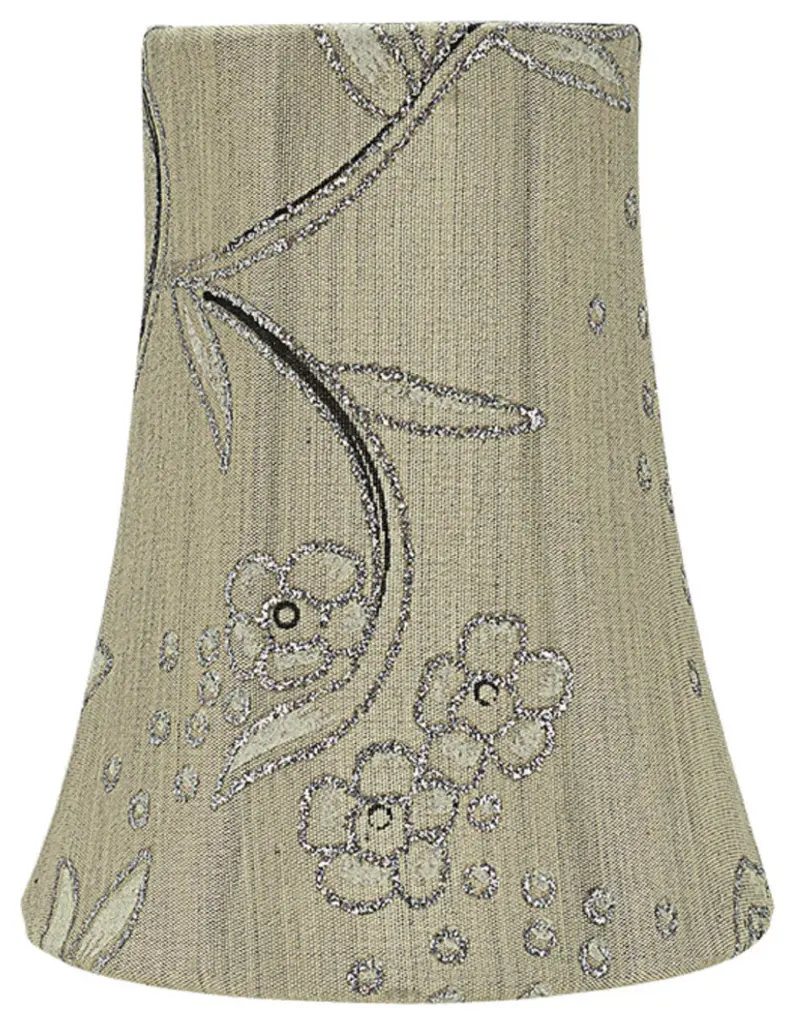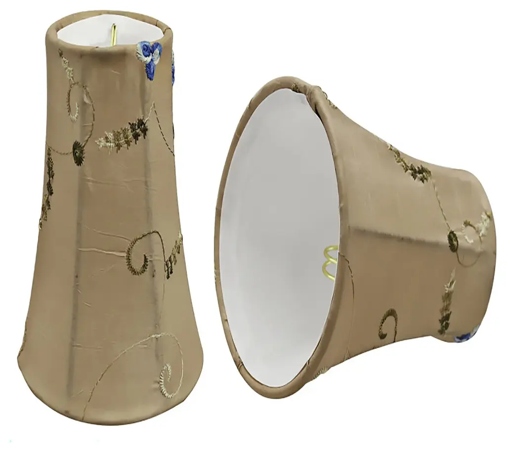 Aspen Creative is dedicated to offering a wide assortment of attractive and well-priced portable lamps, kitchen pendants, vanity wall fixtures, outdoor lighting fixtures, lamp shades, and lamp accessories. We have in-house designers that follow current trends and develop cool new products to meet those trends. Product Detail• Bell Shape Transitional (Mini Chandelier Lamp Shades) in Antique Ivory• Bell (clip on) Replacement Shade | Faux silk fabric with floral embroidery pattern• Clip-on style fitter designed for bare Torpedo chandelier bulbs (bend tip bulbs not recommended) either in candelabra base (E12) or medium base (E26), light bulbs not included• Clip On Lamp Shade Dimensions: 2-1/Clip On Lamp Shade Dimensions: 2" top x 4" bottom x 5" slant height