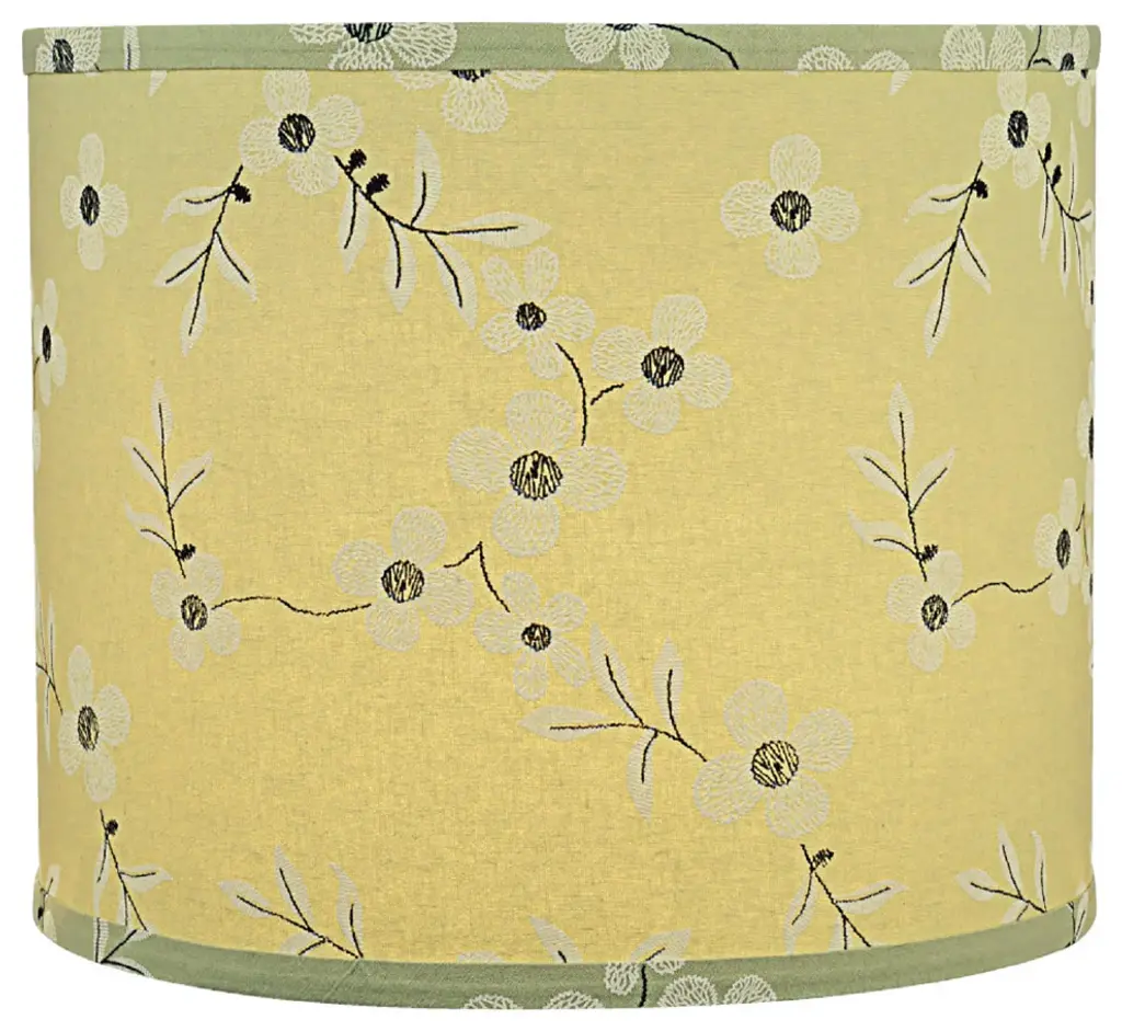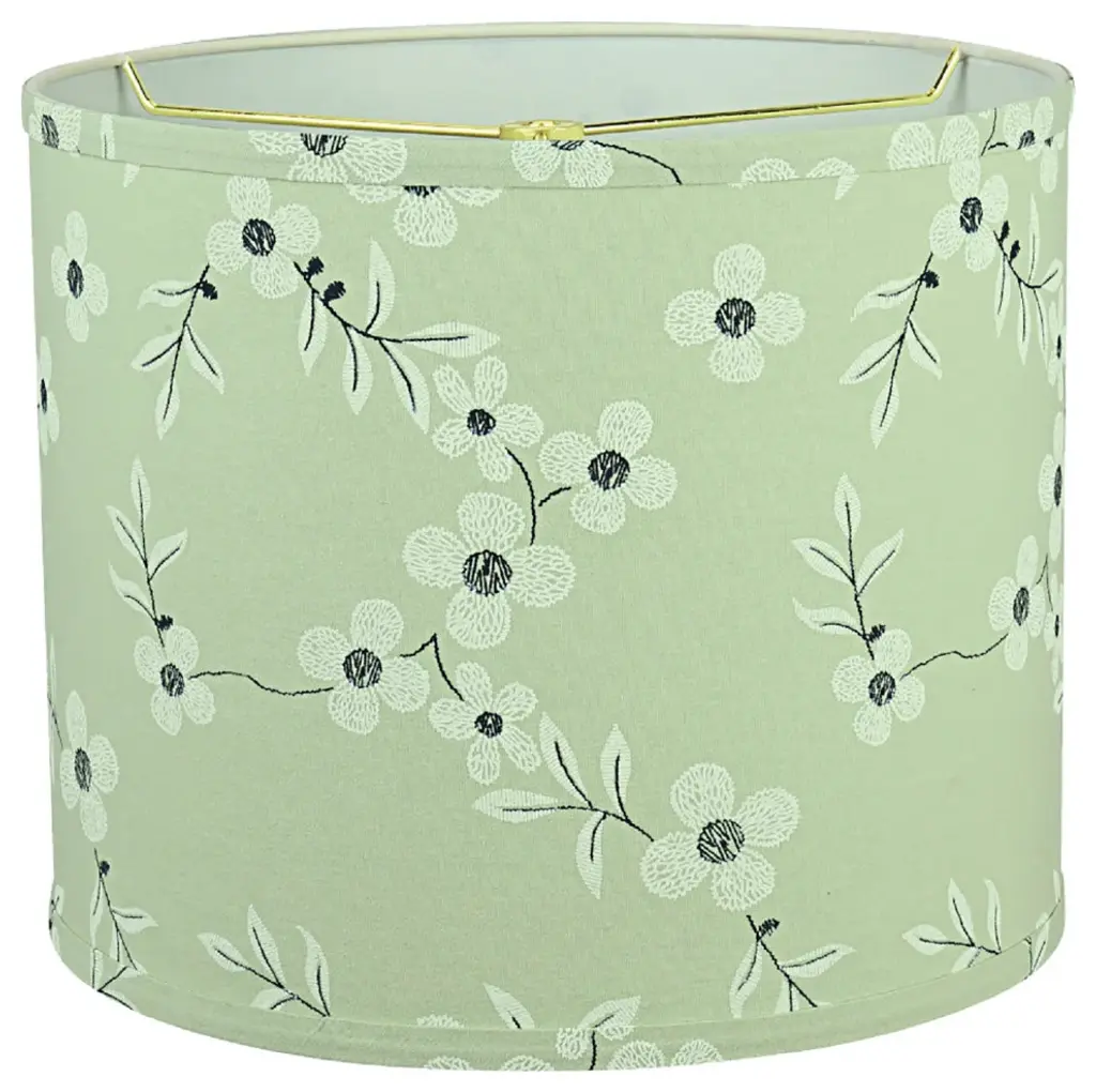 Aspen Creative is dedicated to offering a wide assortment of attractive and well-priced portable lamps, kitchen pendants, vanity wall fixtures, outdoor lighting fixtures, lamp shades, and lamp accessories. We have in-house designers that follow current trends and develop cool new products to meet those trends.Product Detail:• 1 pack transitional drum (cylinder) replacement lamp shade• Printed fabric in light green with white printed flower pattern | 12" top x 12" bottom x 10" height• Spider construction - designed to attach to lamp harp • Applications - For table lamps, accent lamps, vintage lamps, candle stick lamps and kid''s room lamps