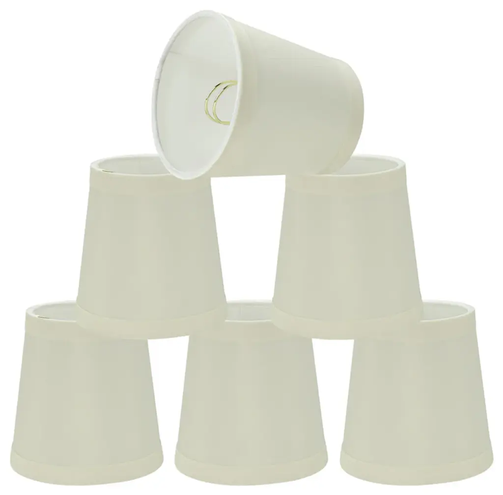Aspen Creative is dedicated to offering a wide assortment of attractive and well-priced portable lamps, kitchen pendants, vanity wall fixtures, outdoor lighting fixtures, lamp shades, and lamp accessories. We have in-house designers that follow current trends and develop cool new products to meet those trends. Product Detail• Hardback Empire Shape Transitional (Mini Chandelier Lamp Shades) in Off White• Hardback Empire (clip on) Replacement Shade | Cotton Fabric• Clip-on style fitter designed for bare Torpedo chandelier bulbs (bend tip bulbs not recommended) either in candelabra base (E12) or medium base (E26), light bulbs not included• Clip On Lamp Shade Dimensions: 3" top x 5" bottom x 4" slant height