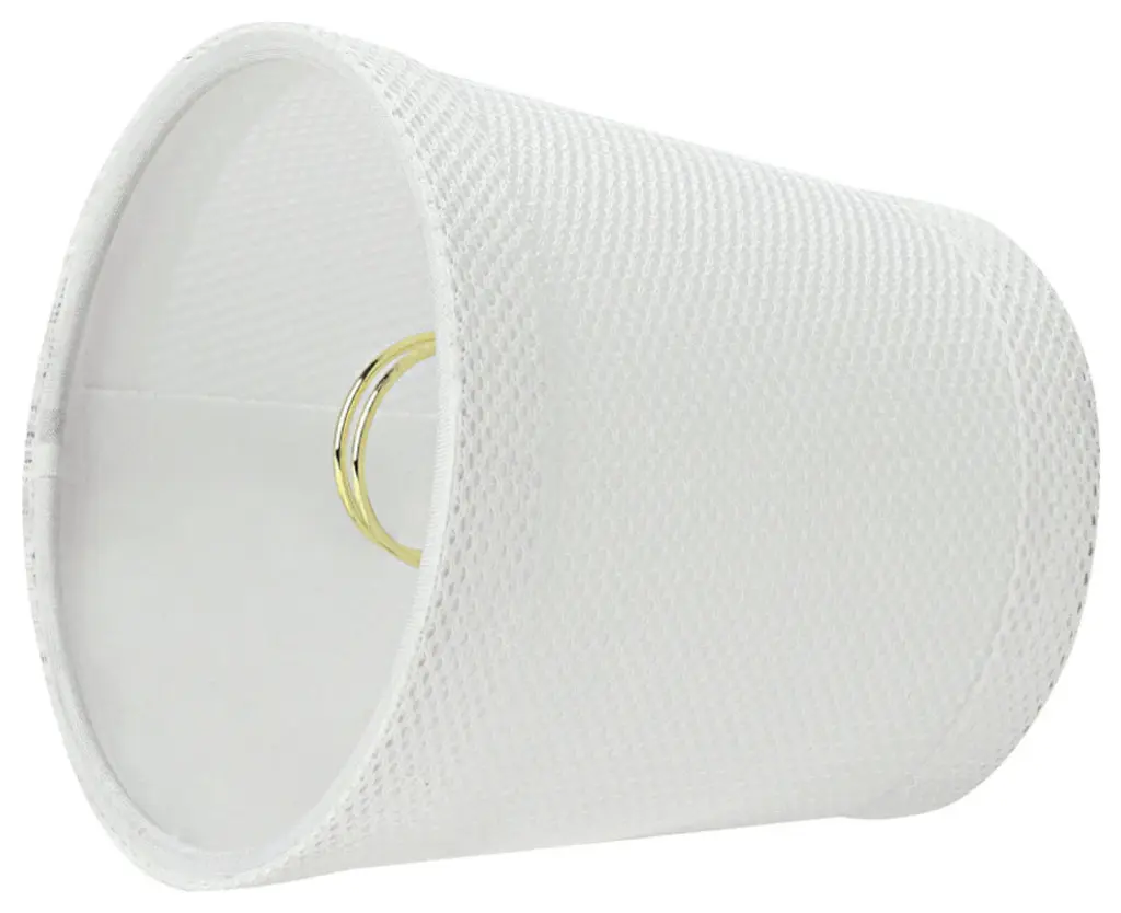 Aspen Creative is dedicated to offering a wide assortment of attractive and well-priced portable lamps, kitchen pendants, vanity wall fixtures, outdoor lighting fixtures, lamp shades, and lamp accessories. We have in-house designers that follow current trends and develop cool new products to meet those trends. Product Detail• Hardback Empire Shape Transitional (Mini Chandelier Lamp Shades) in White• Hardback Empire (clip on) Replacement Shade | Network fabric • Clip-on style fitter designed for bare torpedo chandelier bulbs (bend tip bulbs not recommended) either in candelabra base (E12) or medium base (E26), light bulbs not included• Clip On Lamp Shade Dimensions: 3" top x 4" bottom x 4" slant height | Recommended for use with 40 watt light bulb• Our hardback shades use Virgin Styrene backing board to produce a warm, natural & smooth light � more appealing than shades made with recycled Styrene board that can crack & yellow over time.Aspen Creative Item# 32718-5