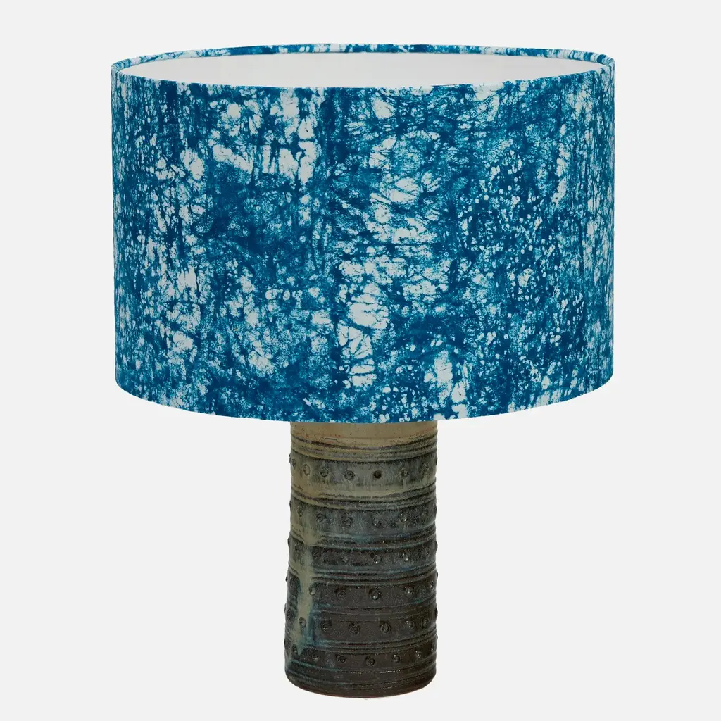 The Batik Sage Green Lamp Shade adds a warm glow to living spaces. The green lamp shades are noticeable with their resist-dye batik pattern in light green. This style is inspired by the traditional Adire textile, a cloth type made by Yoruba women in Nigeria for centuries. The modern lampshade is built in an African style classic drum shape and finished with a hand-rolled edge plus flame retardent lining. The green lampshades brighten up a guest room or entryway and fit seamlessly within a variety of interior design styles. Base is not included.