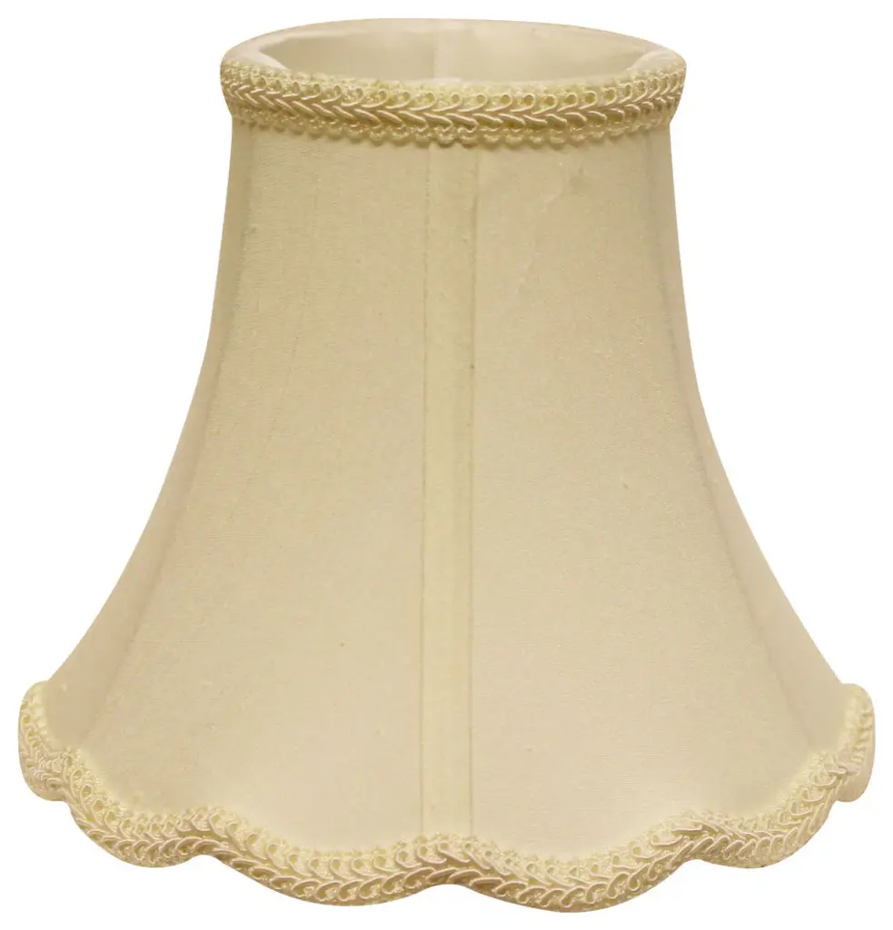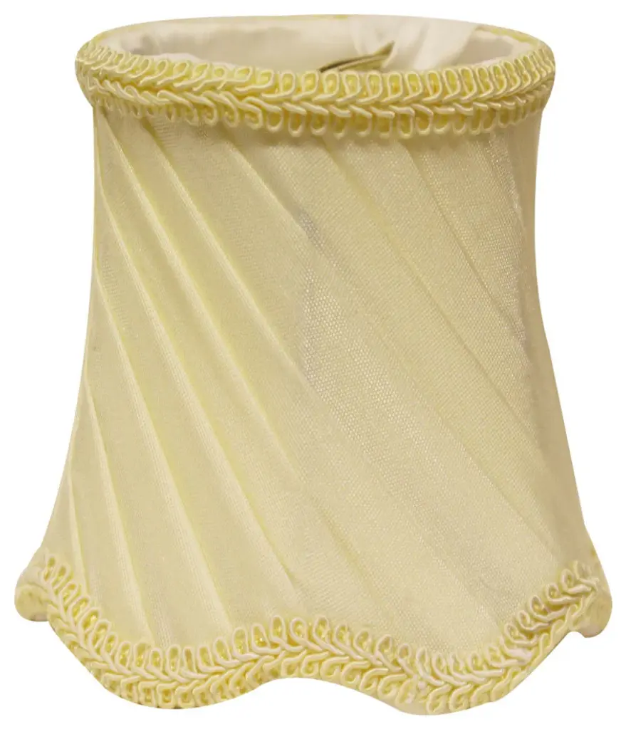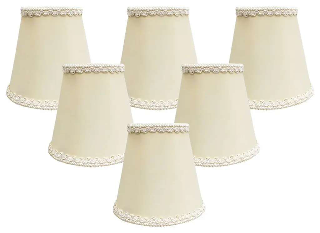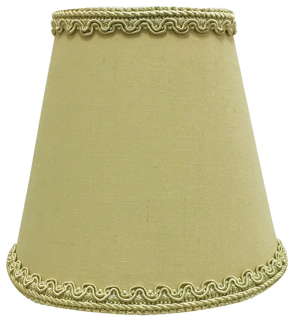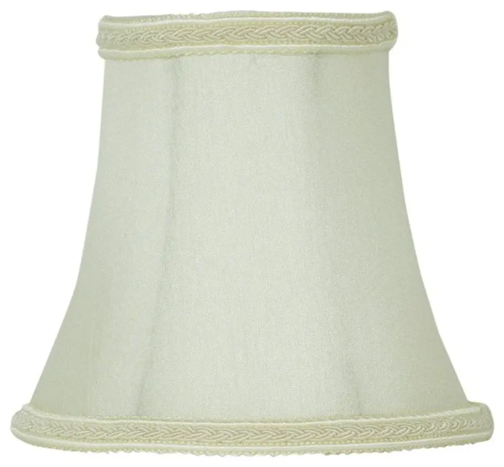 Royal Designs 5-Inch chandelier shades are handmade. You can use them for your chandeliers, wall sconces or small accent lamps. These lamp shades are highest quality and sure to bring a sense of style to any room.-Shade Dimensions: 3" x 5" x 4.5 (Top x Bottom x Height) -Shape: Empire Chandelier Lamp Shade with Designer Trim-Fabric: Hand Tailored Silk-Type Shantung Fabric, No Lining-Fitter: FLAME CLIP, FC, Fitter designed to fit over a Candelabra bulb base., Most clip-on lampshades are designed with double clip, . Suggested maximum wattage is 60-watt candelabra bulb.-Frame: Quality metal frame
