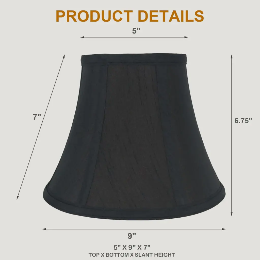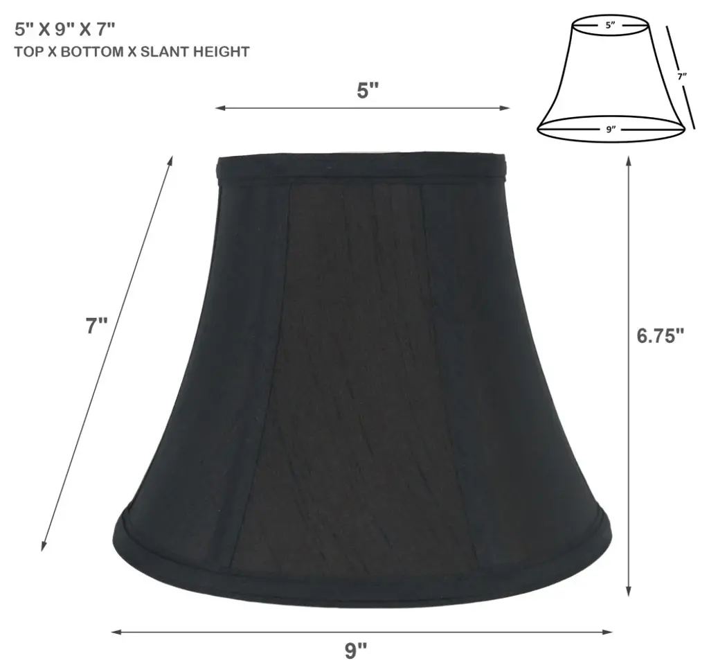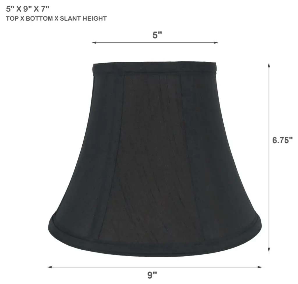 Urbanest faux silk bell lampshadeFaux silk bell with a brushed nickel spider fitter. Shade is black faux silk with beige lining.Top diameter measures 5" across, bottom diameter measures 9" across and 7" slant height.Maximum recommended wattage is 60 watts. Bulb not included.List price is for 1 shade.