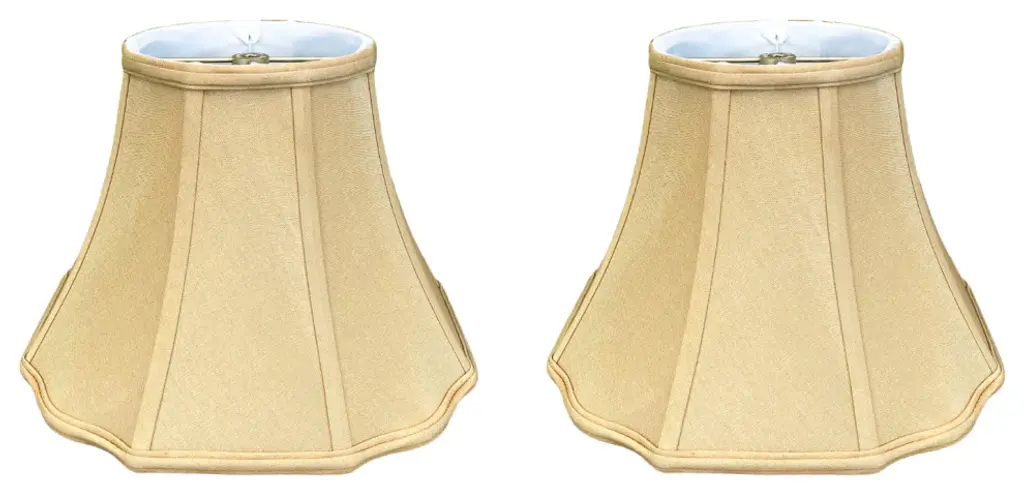 Urbanest faux silk bell lampshadeFaux silk bell with a brushed nickel spider fitter. Shade is gold faux silk with beige lining.Top diameter measures 5" across, bottom diameter measures 9" across and 7" slant height.Maximum recommended wattage is 60 watts. Bulb not included.List price is for 2 shades.