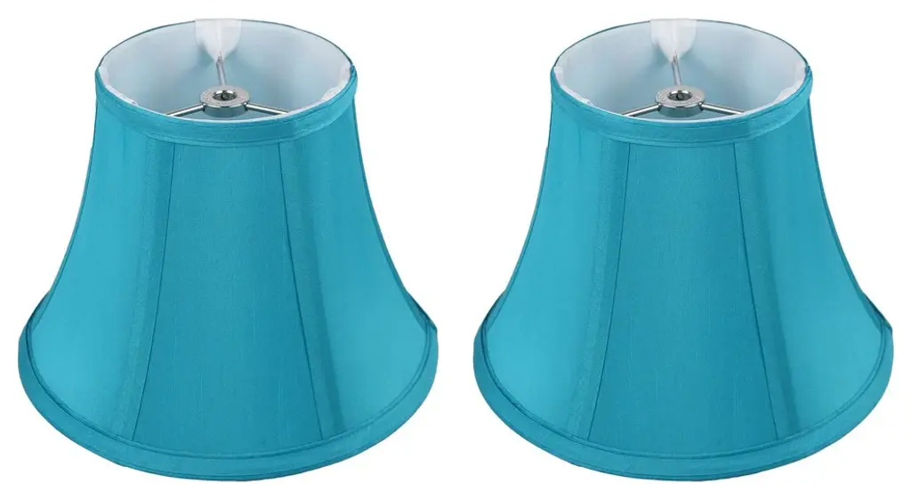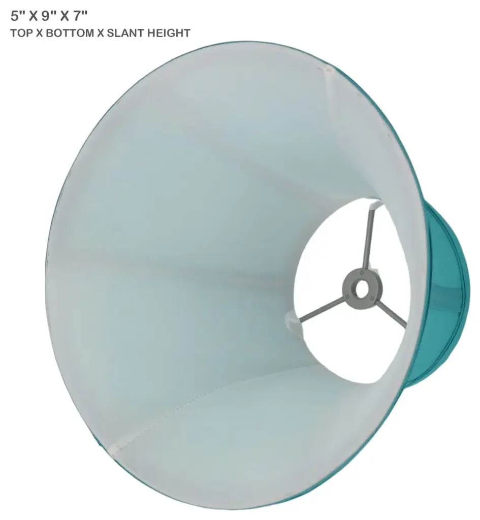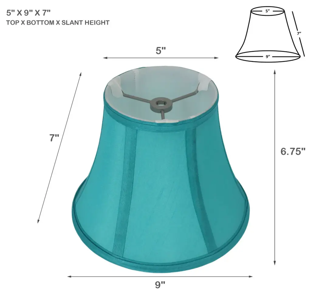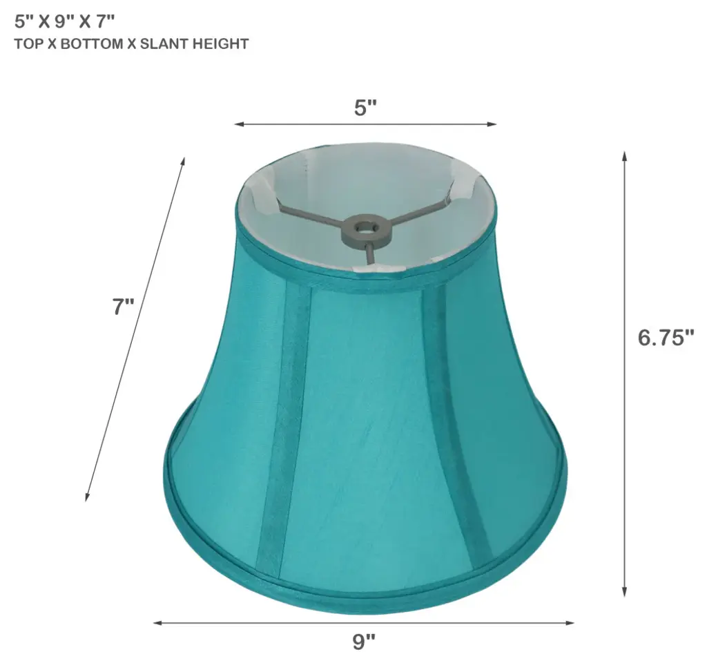 Urbanest faux silk bell lampshadesFaux silk bell with a brushed nickel spider fitter. Shade is teal faux silk with white lining.Top diameter measures 5" across, bottom diameter measures 9" across and 7" slant height.Maximum recommended wattage is 60 watts. Bulb not included.List price is for 2 shades.