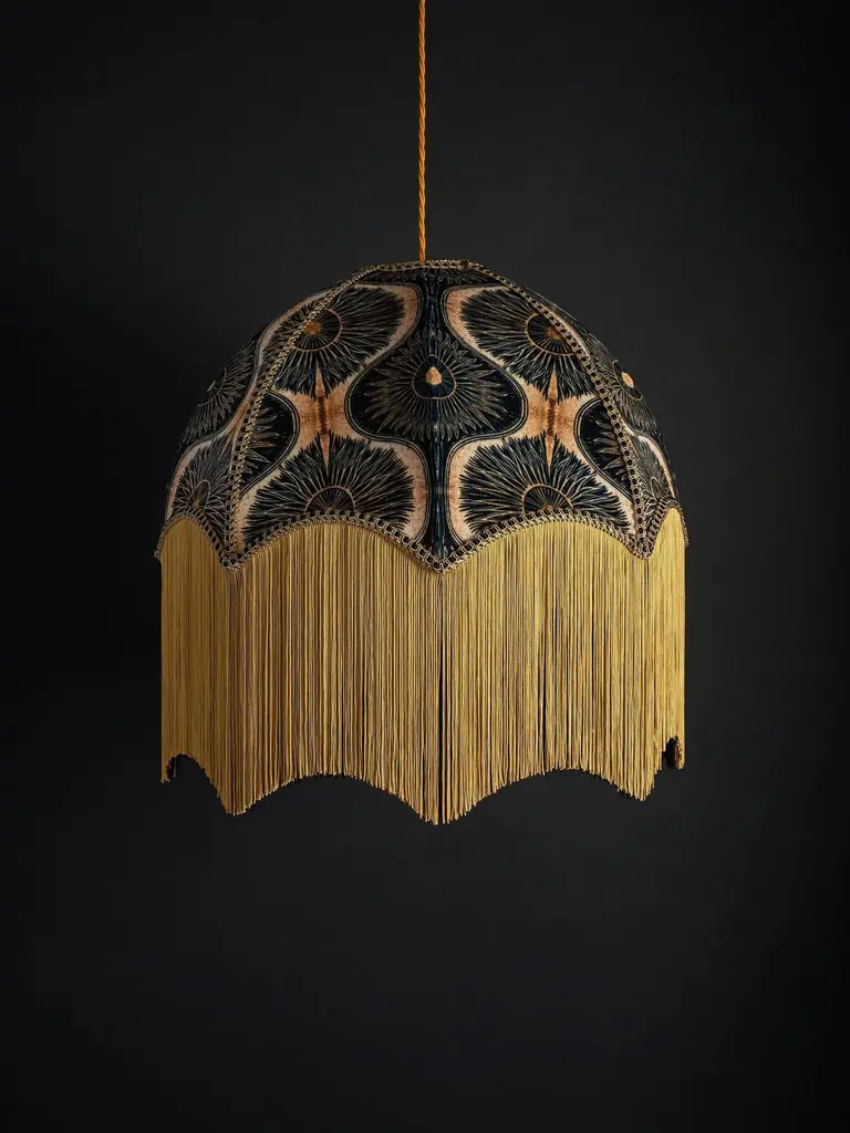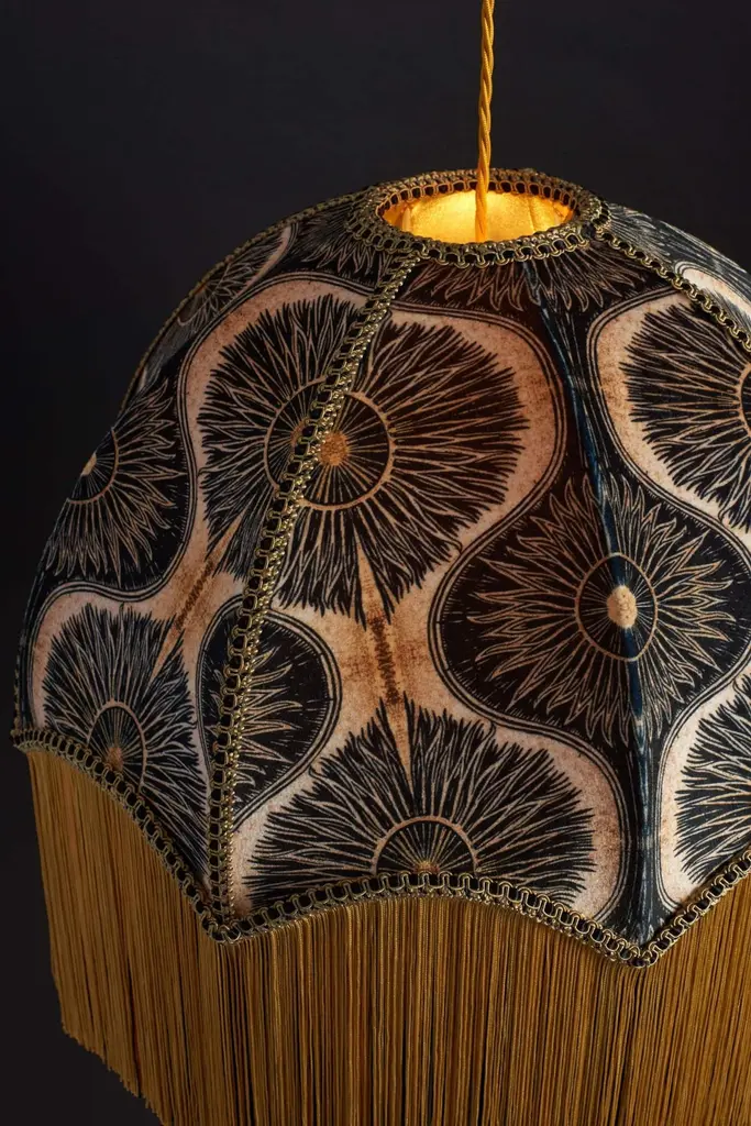 Bibana is our signature design, beautifully displayed on a timeless fringed lampshade. Created by Anna from a linoprint, this decadent black and gold floral print lends itself to many different eras creating a vintage bohemian vibe.Anna Hayman lampshades create a fantastic centrepiece to a room and work as well on a lamp base as they do as pendants, especially now we are able to offer gold linings. Treat yourself to a beautiful piece of artistry, all made in the UK.Every piece is handmade to order and takes 5-7 weeks to be made and delivered. A piece for your interior to treasure and delight in, these emit a soft glow which lights up a room so beautifully.The Duchess satin lets more light through than the velvet, as does the white lining rather than the gold. You can use a higher wattage/lumen strength bulb if you’d like the heavier velvet fabric.The dimensions are below – please bear in mind fringe colour/length is able to be altered easily as is the braid trim. Do email us for alternative options.Frame Diameter: 16"Frame Height: 9.5"Fringe Length if Pendant Fitting: 8"Fringe Length if Lamp Base Fitting: 6"Flex and fitting are not included.The attachment for your lamp or pendant fitting is included – choice of lamp or hanging pendant attachment, these are both adjustable for UK or Euro (E27) fittings, as well as US E26. Email us if you’d like further information on this.