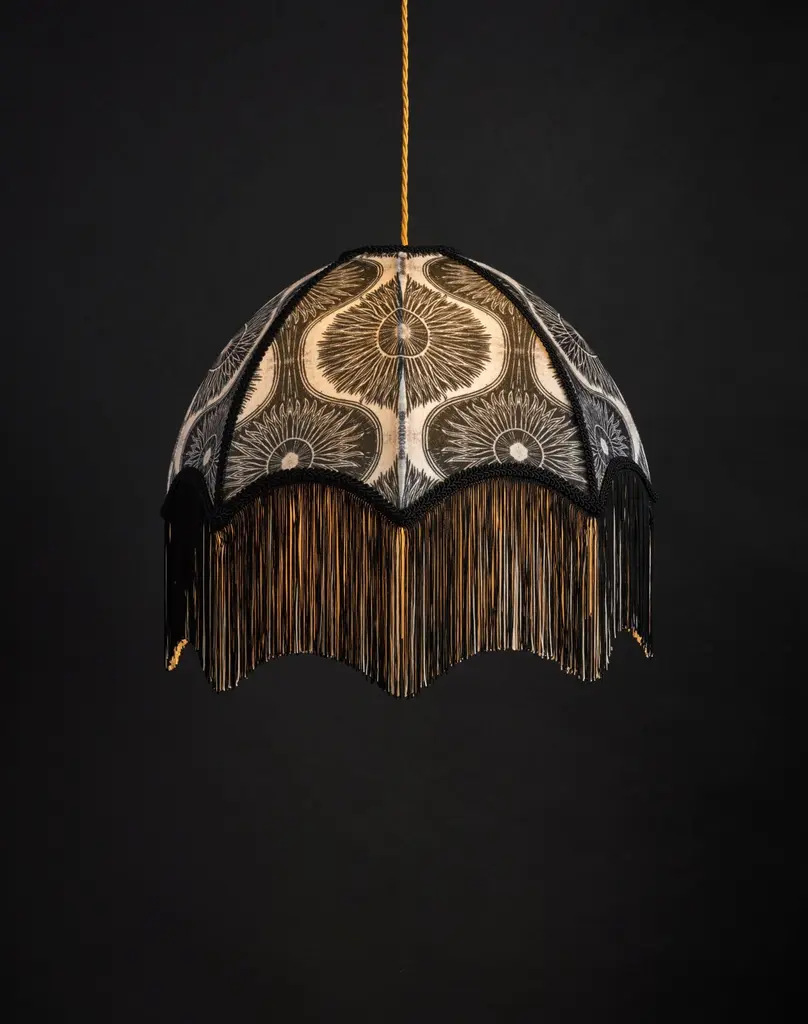 Our iconic Bibana design in a neutral colour way – pewter with silver accents and soft black. A relaxing linocut print, this design echoes an Arts and Crafts feel with its undulating floral flow.Anna Hayman lampshades create a fantastic centrepiece to a room and work as well on a lamp base as they do as pendants, especially now we are able to offer gold linings. Treat yourself to a beautiful piece of artistry, all made in the UK.Every piece is handmade to order and takes 5-7 weeks to be made and delivered. A piece for your interior to treasure and delight in, these emit a soft glow which lights up a room so beautifully.The Duchess satin lets more light through than the velvet, as does the white lining rather than the gold. You can use a higher wattage/lumen strength bulb if you’d like the heavier velvet fabric.The dimensions are below – please bear in mind fringe colour/length is able to be altered easily as is the braid trim. Do email us for alternative options.Frame Diameter: 22"Frame Height: 12"Fringe Length: 8"Flex and fitting are not included.The attachment for your lamp or pendant fitting is included – choice of lamp or hanging pendant attachment, these are both adjustable for UK or Euro (E27) fittings, as well as US E26. Email us if you’d like further information on this.