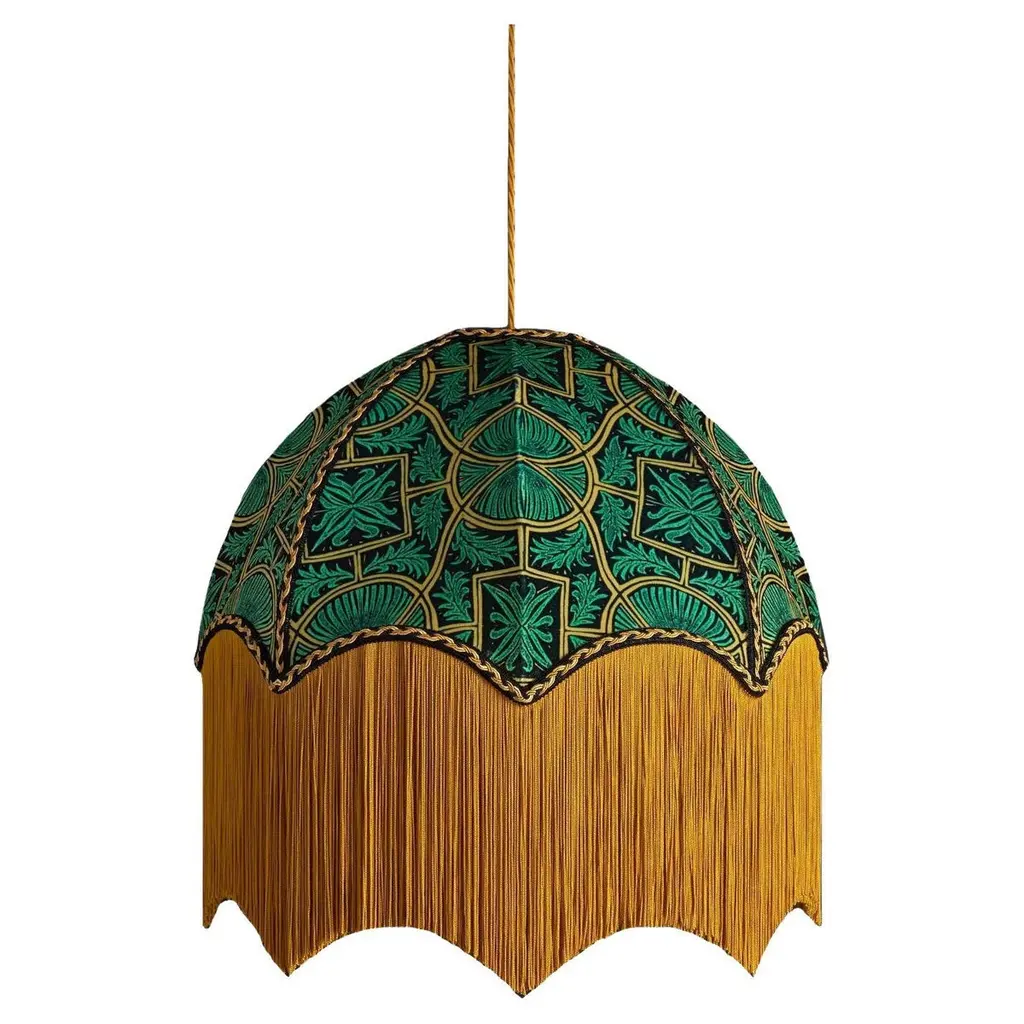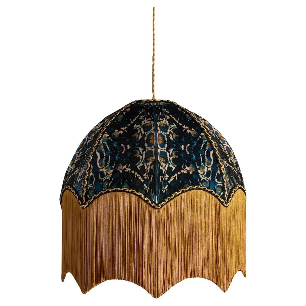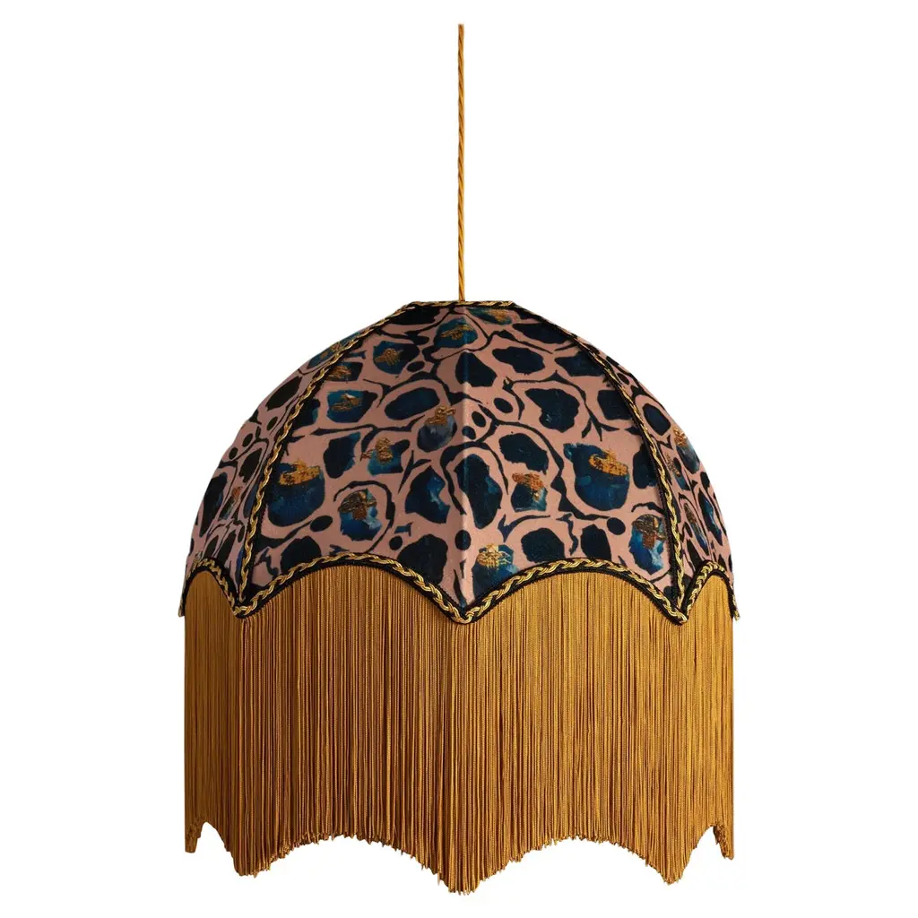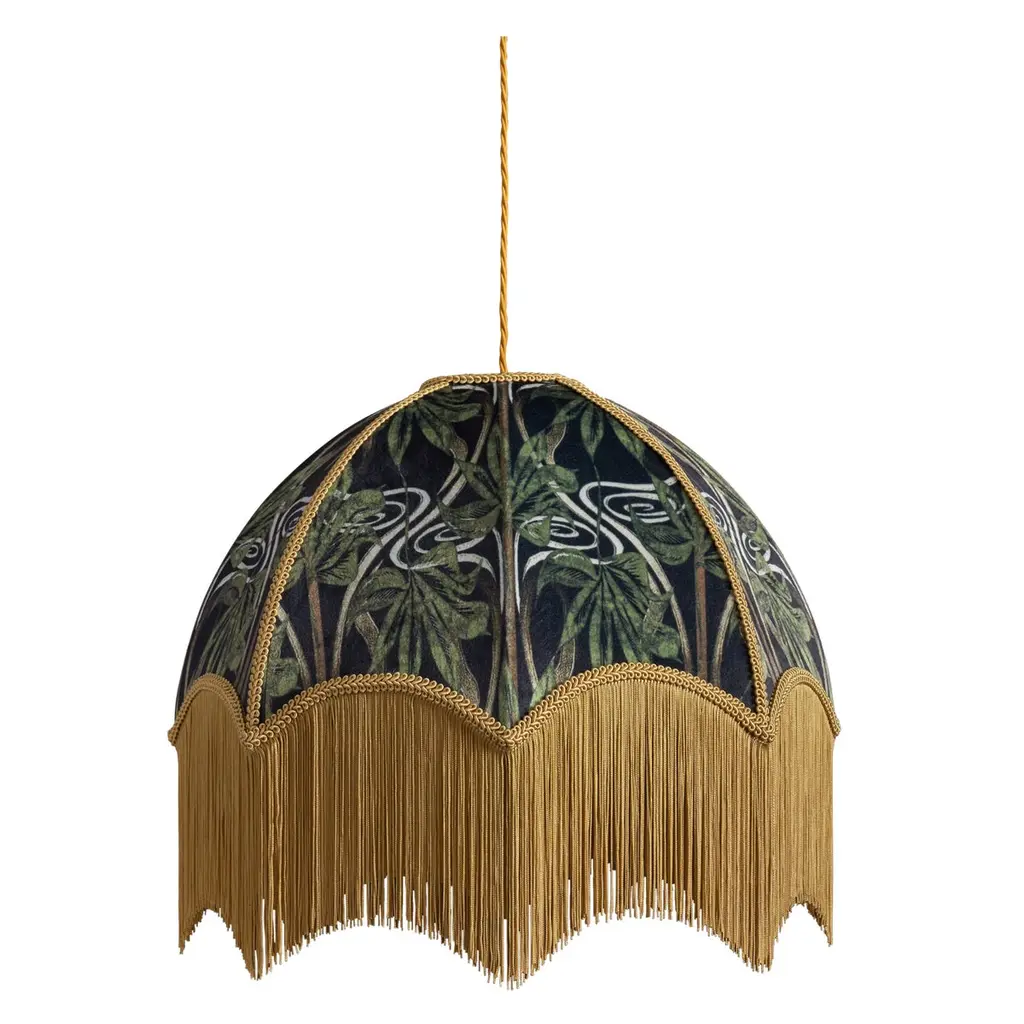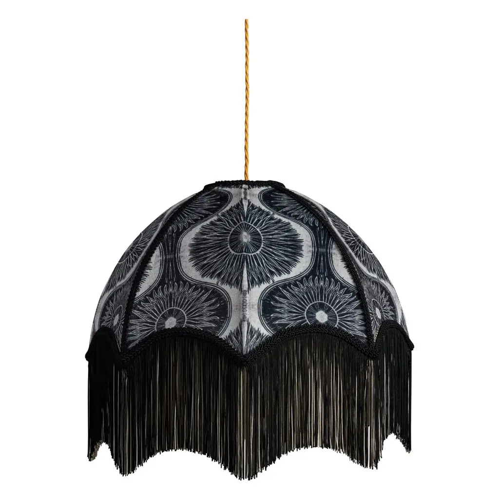 Our iconic Bibana design in a neutral colour way – pewter with silver accents and soft black. A relaxing linocut print, this design echoes an Arts and Crafts feel with its undulating floral flow.Anna Hayman lampshades create a fantastic centrepiece to a room and work as well on a lamp base as they do as pendants, especially now we are able to offer gold linings. Treat yourself to a beautiful piece of artistry, all made in the UK.Every piece is handmade to order and takes 5-7 weeks to be made and delivered. A piece for your interior to treasure and delight in, these emit a soft glow which lights up a room so beautifully.The Duchess satin lets more light through than the velvet, as does the white lining rather than the gold. You can use a higher wattage/lumen strength bulb if you’d like the heavier velvet fabric.The dimensions are below – please bear in mind fringe colour/length is able to be altered easily as is the braid trim. Do email us for alternative options.Frame Diameter: 18"Frame Height: 10.5"Fringe Length: 8"Flex and fitting are not included.The attachment for your lamp or pendant fitting is included – choice of lamp or hanging pendant attachment, these are both adjustable for UK or Euro (E27) fittings, as well as US E26. Email us if you’d like further information on this.