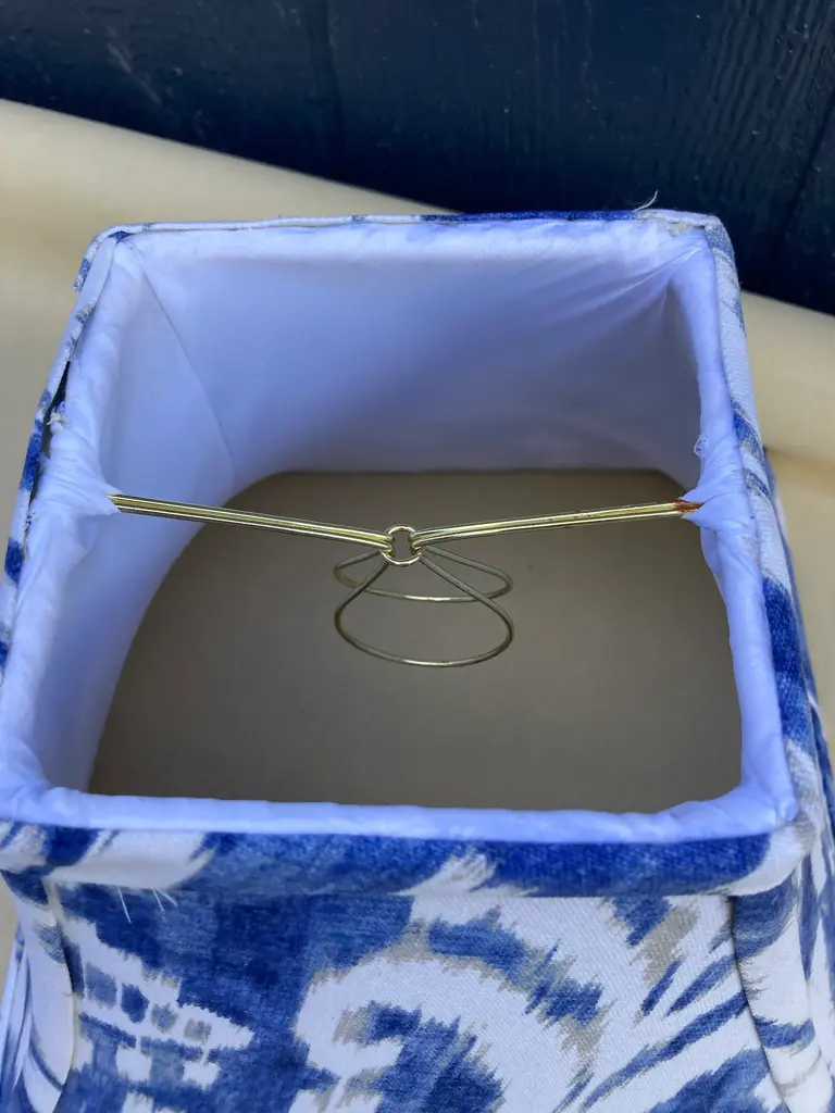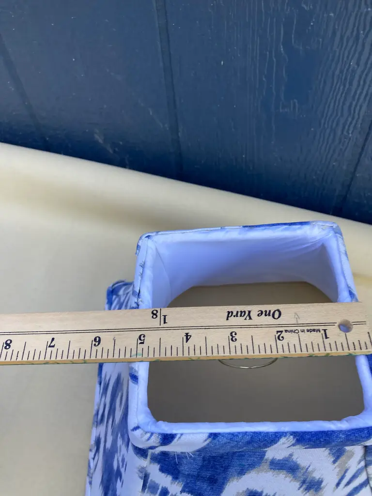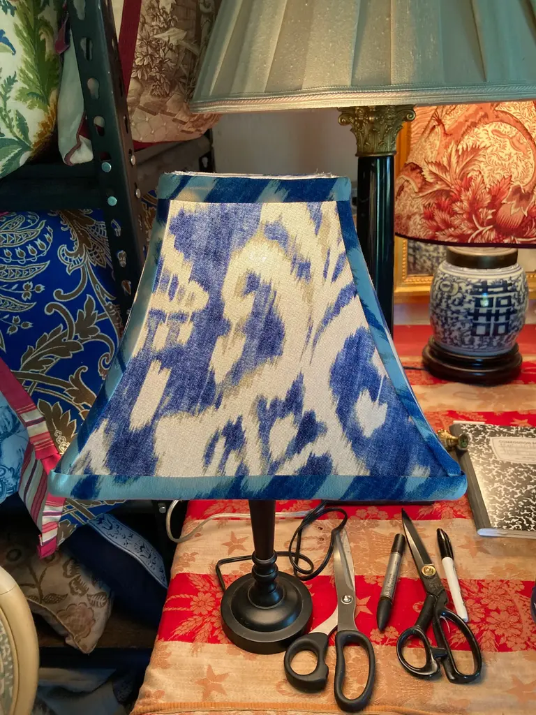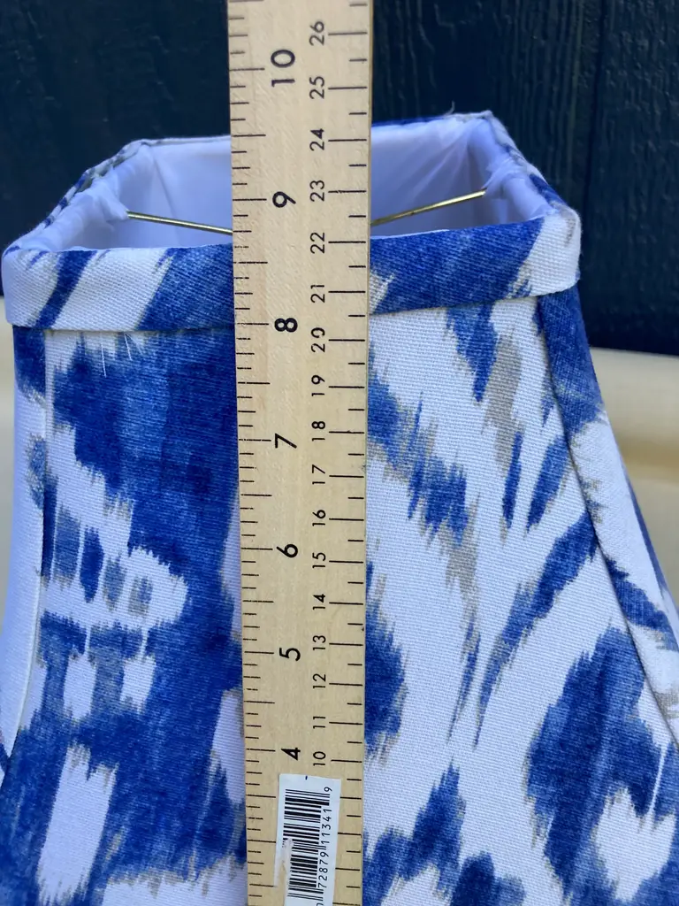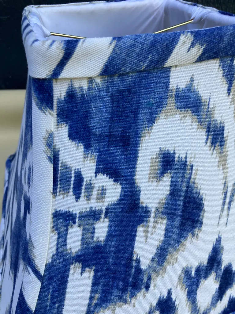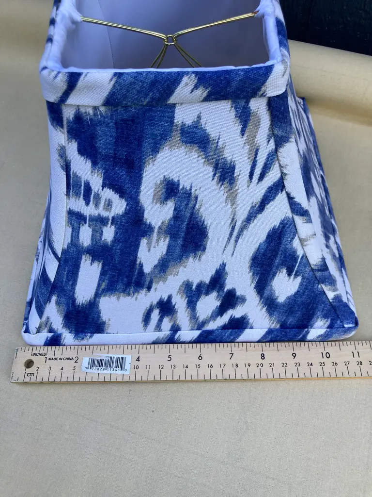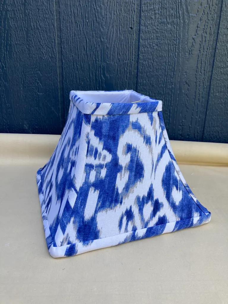 A clip top square shade handmade with cotton ikat woven fabric. Measurements”top 5” bottom 11” side 8.5” 2 are available