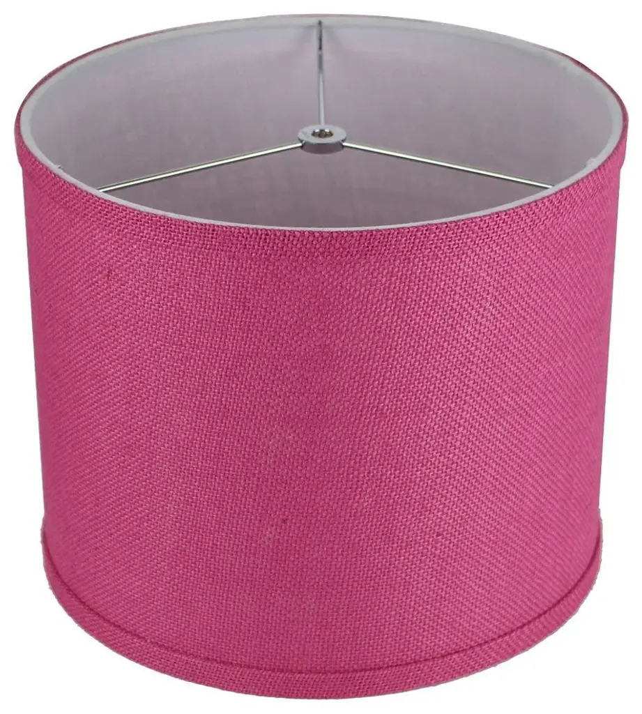 Urbanest classic drum lampshade in fuchsia burlap is a way to add textural light to any space. The top diameter measures 12" across, the bottom diameter measures 12" across, and 10" overall height. Spider harp fitter works with most standard harps and lamp bases. Bulb not included.
