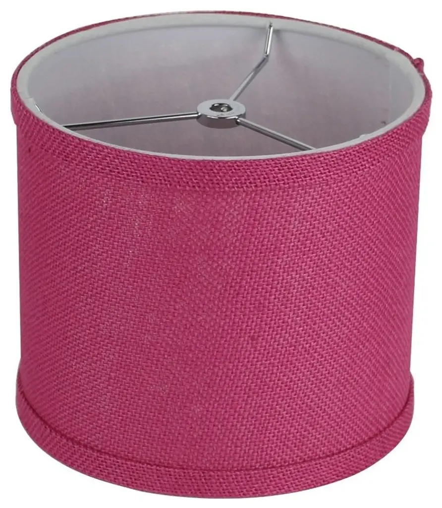 Urbanest classic drum lampshade in fuchsia burlap is a way to add textural light to any space. The top diameter measures 8" across, the bottom diameter measures 8" across, and 7" overall height. Spider harp fitter works with most standard harps and lamp bases. Bulb not included.