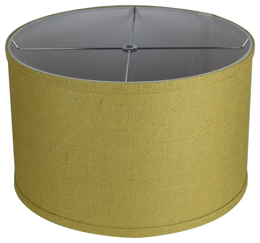 Urbanest classic drum lampshade in mustard yellow burlap is a way to add textural light to any space. The top diameter measures 16" across, the bottom diameter measures 16" across, and 10" overall height. Spider harp fitter works with most standard harps and lamp bases. Bulb not included.