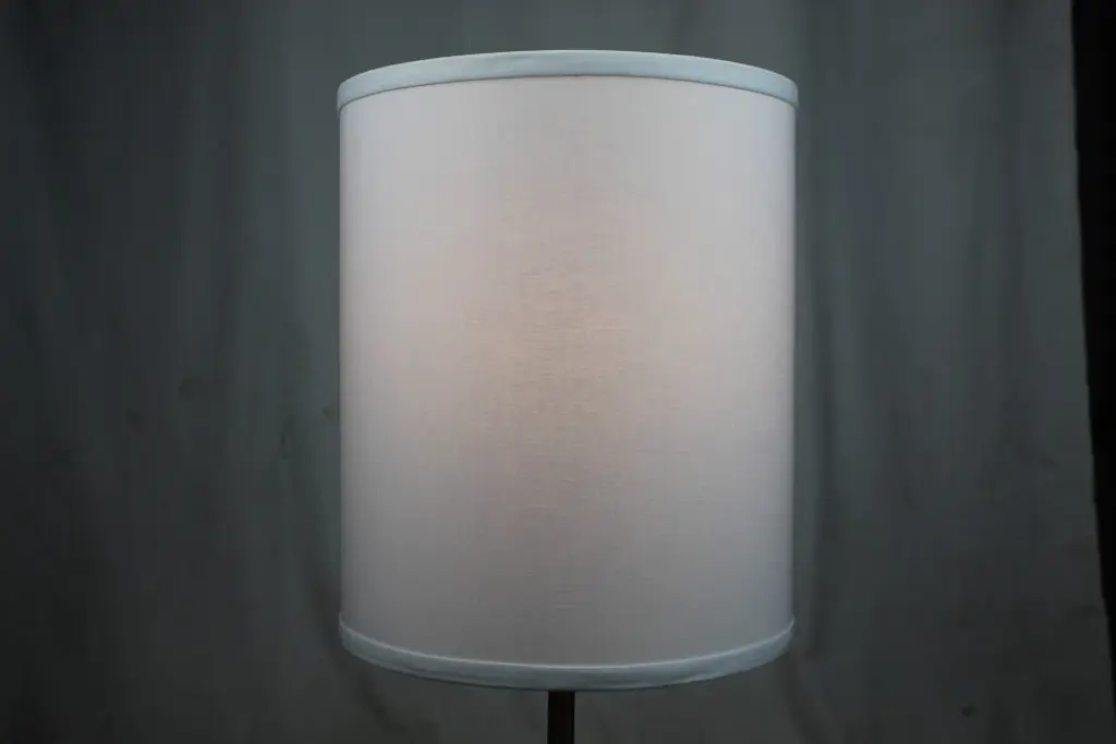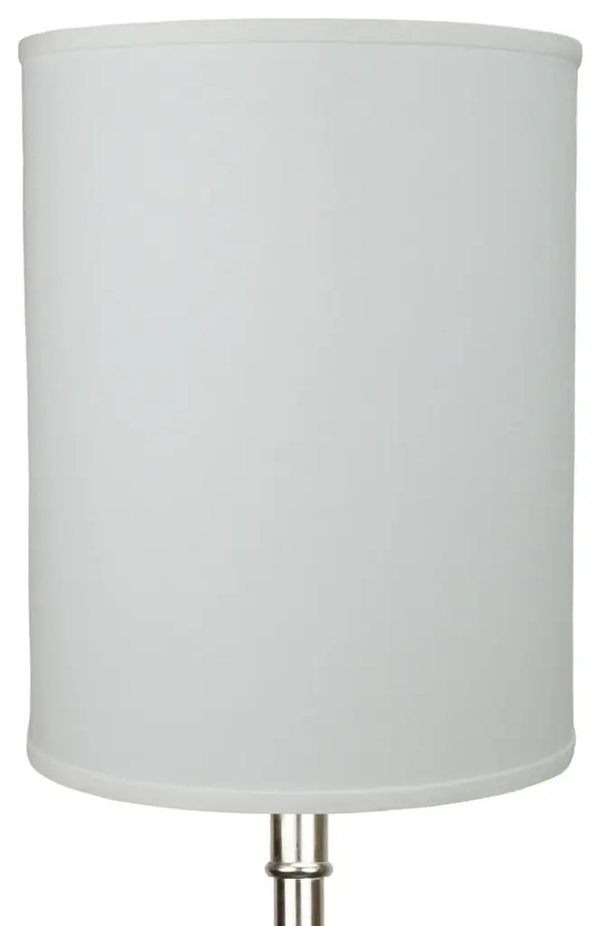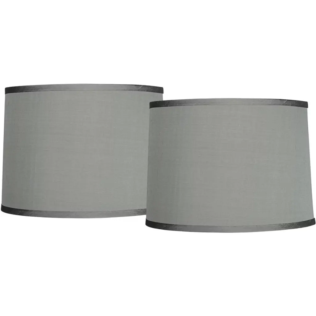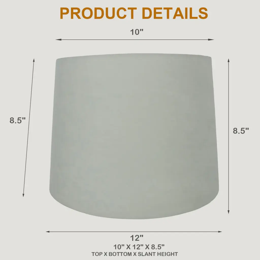 Urbanest off white cotton with gray trim hardback perfect drum lamp shade. Shades measure 12" across the top, 12" across the bottom, and 10" overall height. Lining is white; spider fitter is brushed nickel. Maximum recommended wattage is 100 watts. Bulb not included.