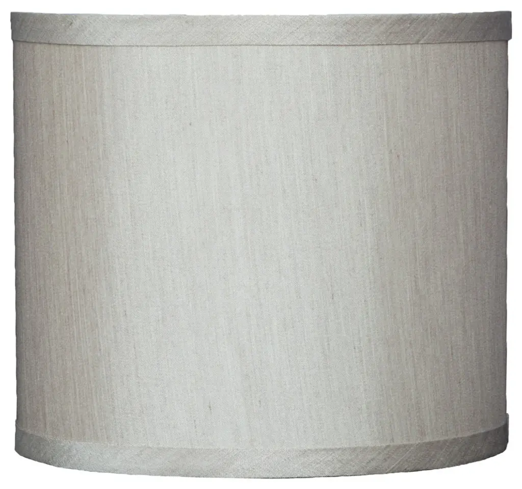 Urbanest taupe faux silk hardback perfect drum lamp shade. Shades measure 12" across the top, 12" across the bottom, and 10" overall height. Lining is white; spider fitter is brushed nickel. Maximum recommended wattage is 100 watts. Bulb not included.