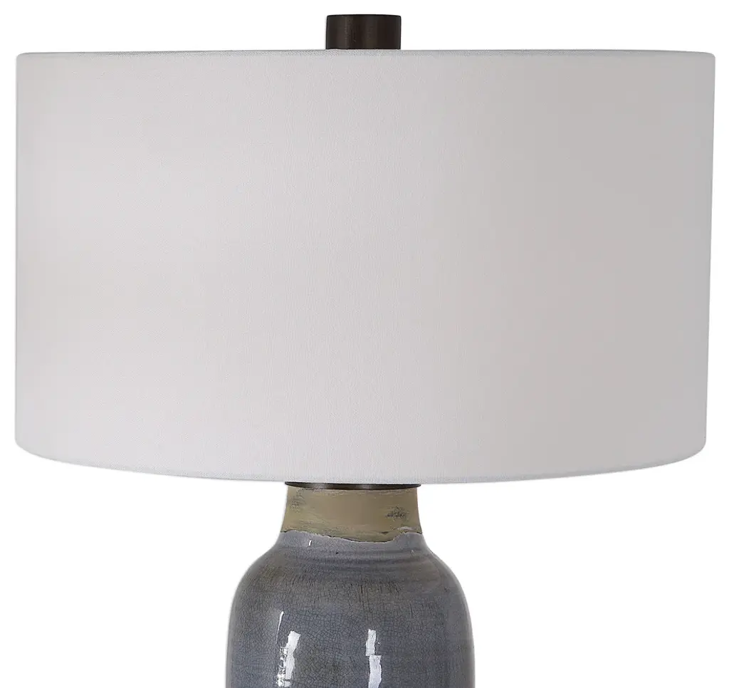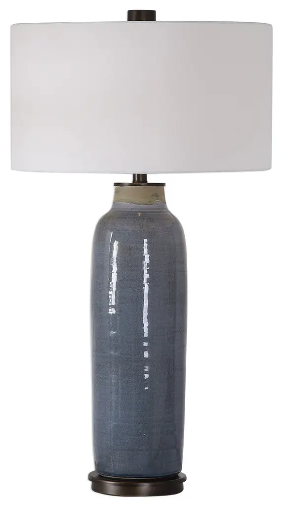 This Table Lamp Lends A Touch Of Old-world, Handcrafted Style With This Ceramic Base Finished In A Distressed Slate Blue Glaze Accented With Oil Rubbed Bronze Accents. The Round Hardback Drum Shade Is A White Linen Fabric. Due To The Nature Of Fired Glazes On Ceramic Lamps, Finishes Will Vary Slightly.• 18" dia x 33.5"H. Weighs 18 lbs.• Hand Finished Ceramic and Steel with Fabric Shade• UL Listed. Uses one max 150 watt bulb (not included). Three way switch• Heirloom Quality - Expertly hand crafted and hand finished. Due to the hand crafted nature of this piece, each piece may have subtle differences.