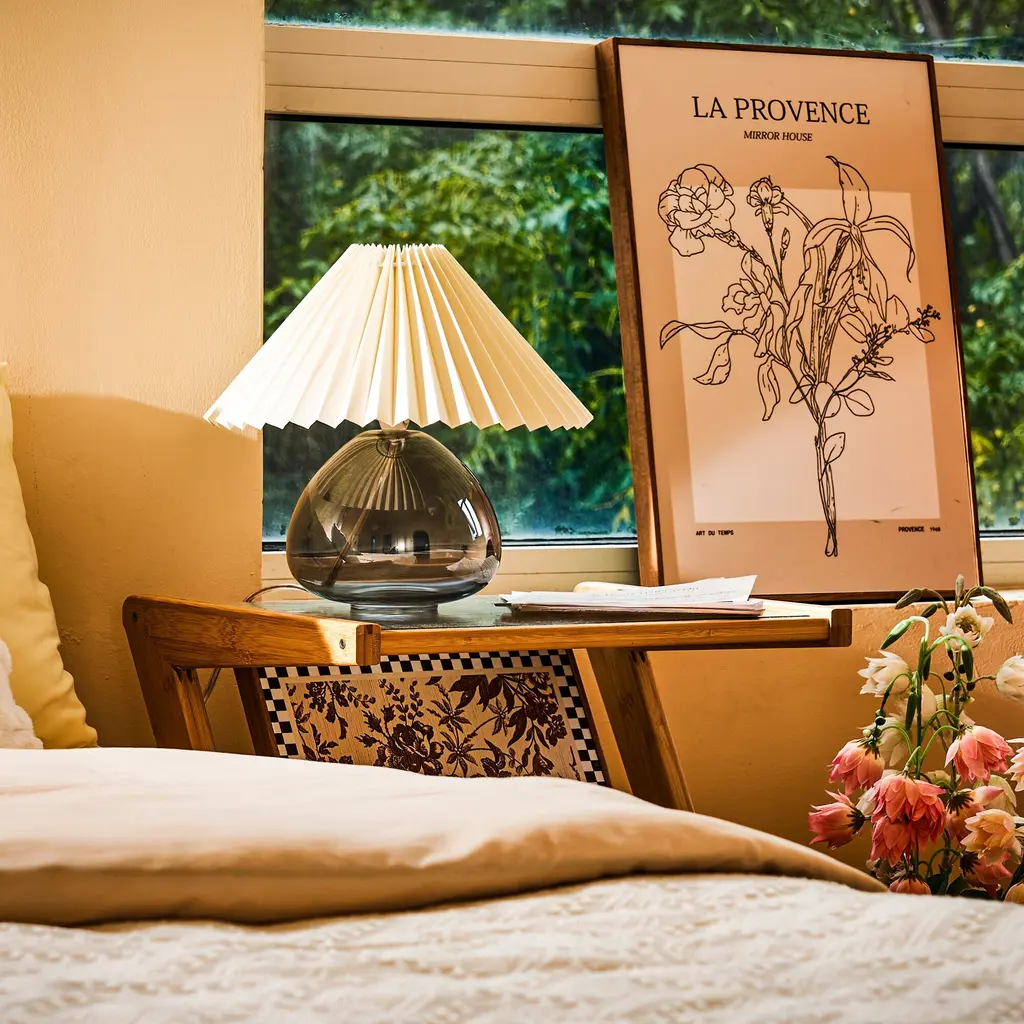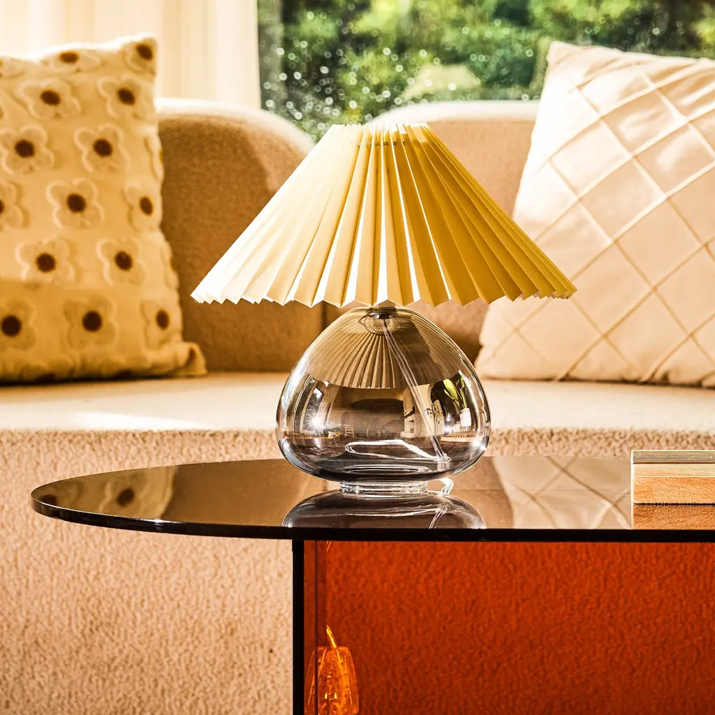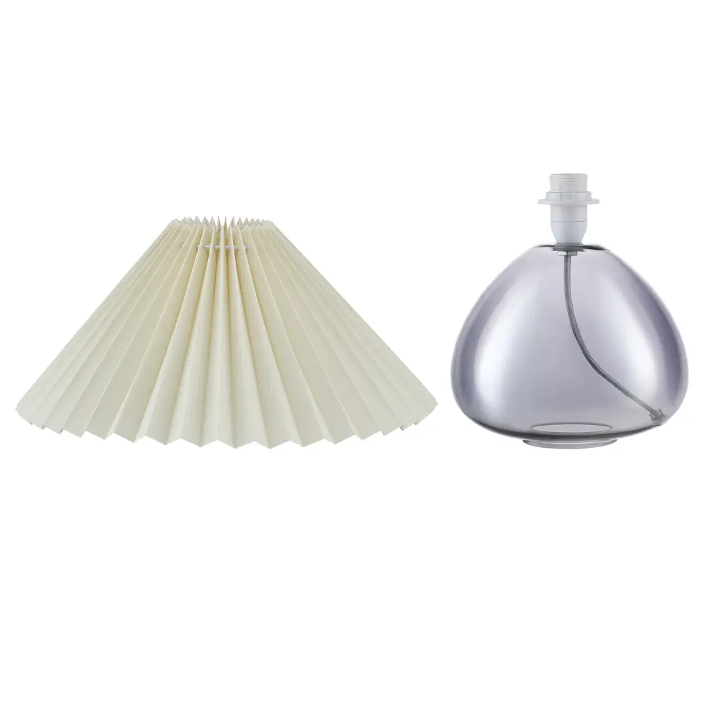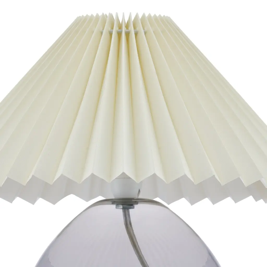 Minimalist blended with a sprinkle of chic vintage appeal, this table lamp is sure to shine as it rounds out a living room desk vignette or lends illumination to a nightstand. Contrasted by the pleated nylon shade sitting up top, the bell-shaped gold/grey glass base completes the aesthetic with an elegant glossy touch. Perfect when perched on your bedside table, work desk, or hallway console, our desk lamp will illuminate your way through late-night reading, meditating, and more.Features:Specifications: