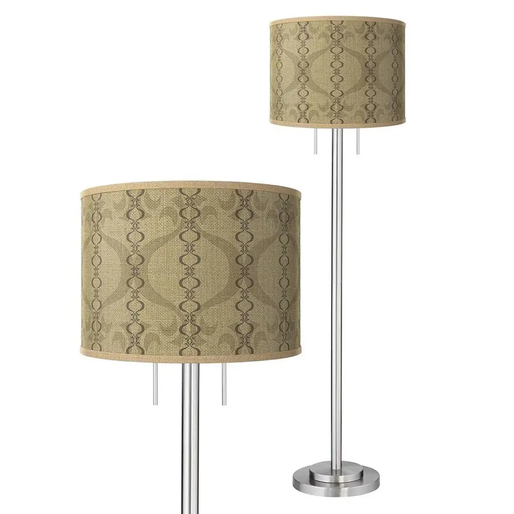 PRODUCT DETAILS: 63" high overall. Base is 12" wide. Drum shade is 18" wide x 12 3/4" high. Uses two maximum 100 watt standard-medium base light bulbs (not included). On-off pull chain switches for easy lighting control. Sleek contemporary floor lamp from the Giclee Glow brand. Use to brighten living rooms or for bedroom lighting. Custom made-to-order drum shade with the exclusive Colette giclee printed pattern. Exclusive shade design by pattern designer Katja Hockenberg. Brushed nickel finish base and pole. Metal construction. 8-foot long cord. DESCRIPTION: The Garth brushed nickel finish floor lamp takes a simple base design and pairs it with a striking printed drum shade for a burst of style.
