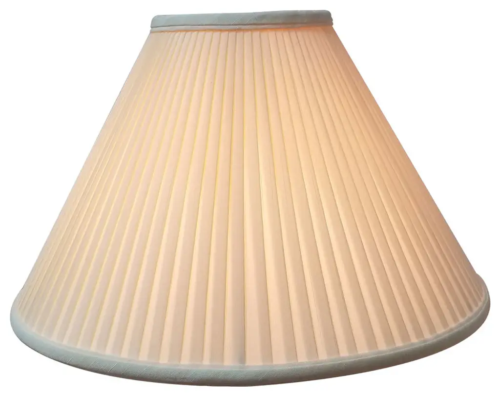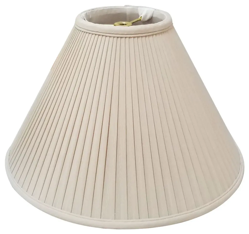 This Coolie Empire Side Pleat Basic Lampshade is a part of Royal Designs, Inc. Timeless Basic Shade Collection and is perfect for anyone who is looking for a traditional yet stunning lampshade. Royal Designs has been in the lampshade business since 1993 with their multiple shade lines that exemplify handcrafted quality and value.Exterior Fabric: Hand Tailored Silk-Type Shantung (except Linen, Mouton, Burlap & Faux Rawhide fabrics)Interior Fabric: Off-White Softback Lining (Black, Burlap & Faux Rawhide fabrics have gold lining)Washer: Standard brass-finish spider fitter, use a finial to fasten shade. (All shades with 9"+ top diameter have a V-Notch fitter for use on a 6 or 8 reflector bowl)Trim: Top and bottom trim (single or double) with vertical pipingFrame: Heavy grade rust resistant metal frameBulb: Suggested maximum wattage is 150-watt for most sizes Height is measured by slant height from top to bottom of the lampshades front facePlease measure your existing shade--a replacement harp may be needed for a proper fit or additional adjustment if changing height of shade