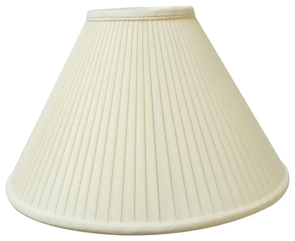 This Coolie Empire Side Pleat Basic Lampshade is a part of Royal Designs, Inc. Timeless Basic Shade Collection and is perfect for anyone who is looking for a traditional yet stunning lampshade. Royal Designs has been in the lampshade business since 1993 with their multiple shade lines that exemplify handcrafted quality and value.Exterior Fabric: Hand Tailored Silk-Type Shantung (except Linen, Mouton, Burlap & Faux Rawhide fabrics)Interior Fabric: Off-White Softback Lining (Black, Burlap & Faux Rawhide fabrics have gold lining)Washer: Standard brass-finish spider fitter, use a finial to fasten shade. (All shades with 9"+ top diameter have a V-Notch fitter for use on a 6 or 8 reflector bowl)Trim: Top and bottom trim (single or double) with vertical pipingFrame: Heavy grade rust resistant metal frameBulb: Suggested maximum wattage is 150-watt for most sizes Height is measured by slant height from top to bottom of the lampshades front facePlease measure your existing shade--a replacement harp may be needed for a proper fit or additional adjustment if changing height of shade