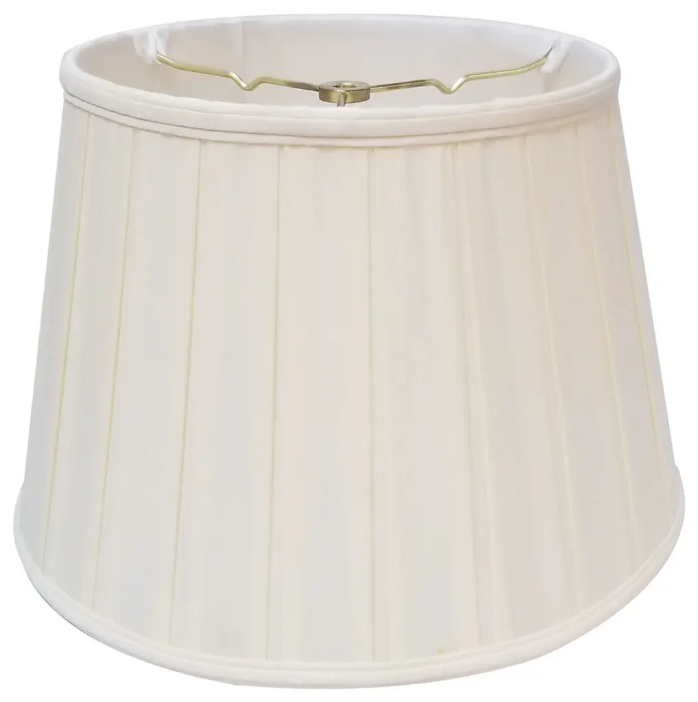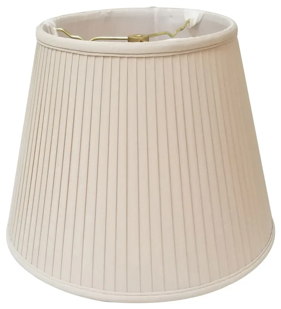 This Deep Empire Side Pleat Basic Lampshade is a part of Royal Designs, Inc. Timeless Basic Shade Collection and is perfect for anyone who is looking for a traditional yet stunning lampshade. Royal Designs has been in the lampshade business since 1993 with their multiple shade lines that exemplify handcrafted quality and value.Exterior Fabric: Hand Tailored Silk-Type Shantung (except Linen, Mouton, Burlap & Faux Rawhide fabrics)Interior Fabric: Off-White Softback Lining (Black, Burlap & Faux Rawhide fabrics have gold lining)Washer: Standard brass-finish spider fitter, use a finial to fasten shade. (All shades with 9"+ top diameter have a V-Notch fitter for use on a 6 or 8 reflector bowl)Trim: Top and bottom trim (single or double) with vertical pipingFrame: Heavy grade rust resistant metal frameBulb: Suggested maximum wattage is 150-watt for most sizes Height is measured by slant height from top to bottom of the lampshades front facePlease measure your existing shade--a replacement harp may be needed for a proper fit or additional adjustment if changing height of shade