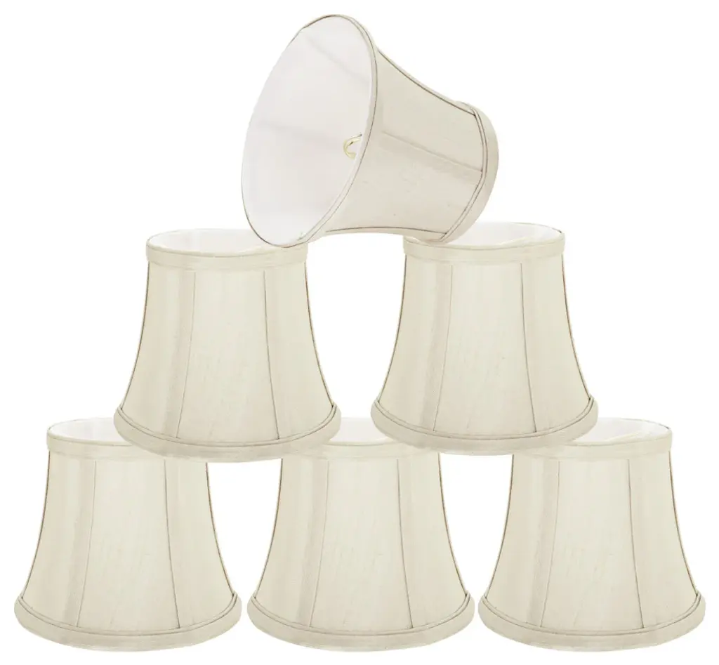 Urbanest silk bell chandelier shade in eggshellThis shade measures 3" across the top, 5" across the bottom, and 4 1/2" overall height.Softback bell shape. Clip-on for candleabra bulbs. Maximum recommended wattage is 25 watts.Lined with white fabricSet of 2 shades