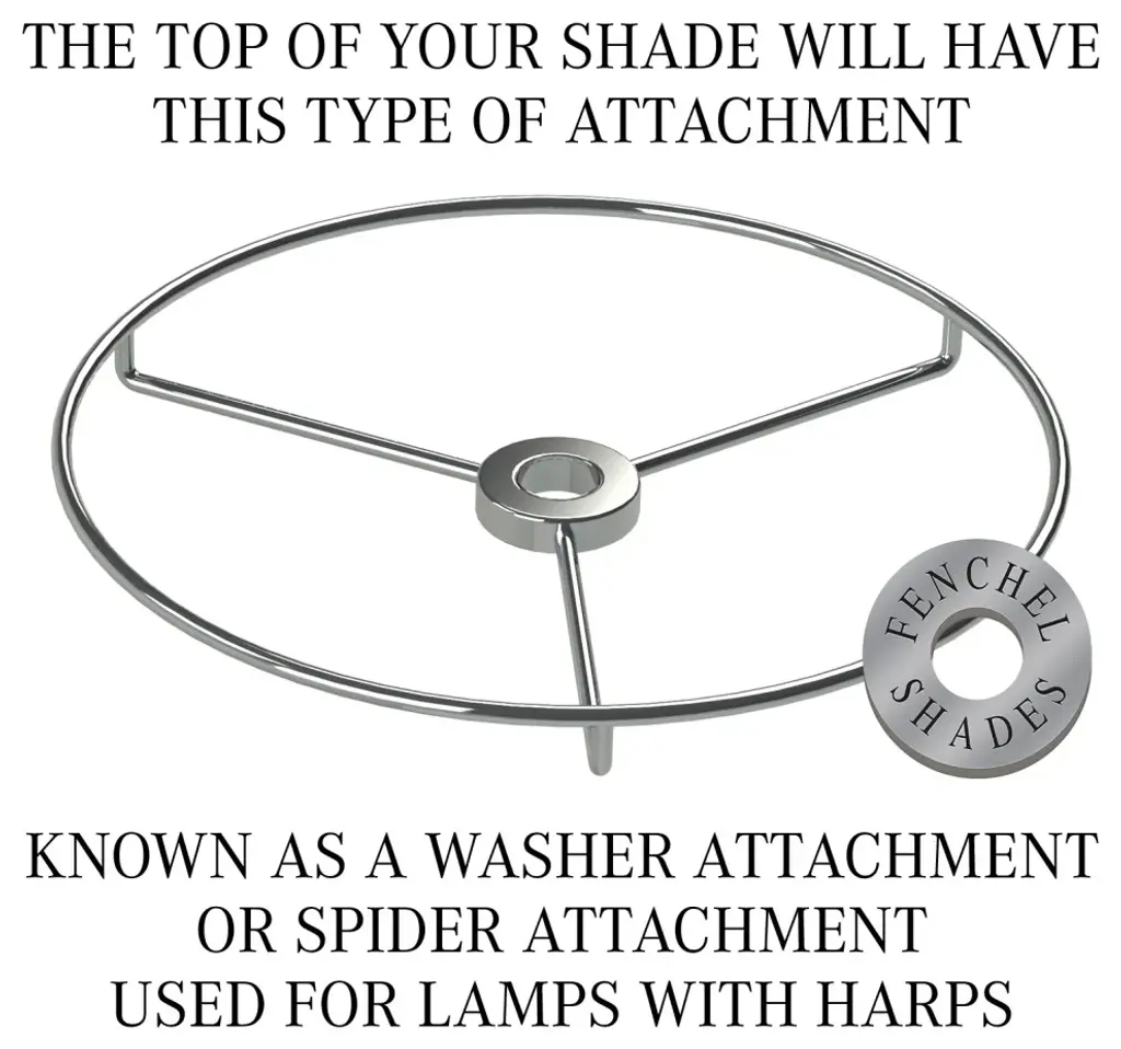 This Fenchel Shades lamp shade has a top diameter of 10 inches, a bottom diameter of 12 inches, and a slant height of 8 inches. The vertical height of this shade is about 8 inches. This attachment is called a washer attachment and is nickel in color. It is also known as a spider attachment. If your lamp has a harp, then you will generally need a washer attachment. The hole size (inner-dimension) of a washer attachment measures slightly under 1/2 inch. The drop on this particular attachment is 1/2 inch. That means, it recesses about 1/2 inch below the top of the lamp shade. This Product is proudly made in the USA with US materials.