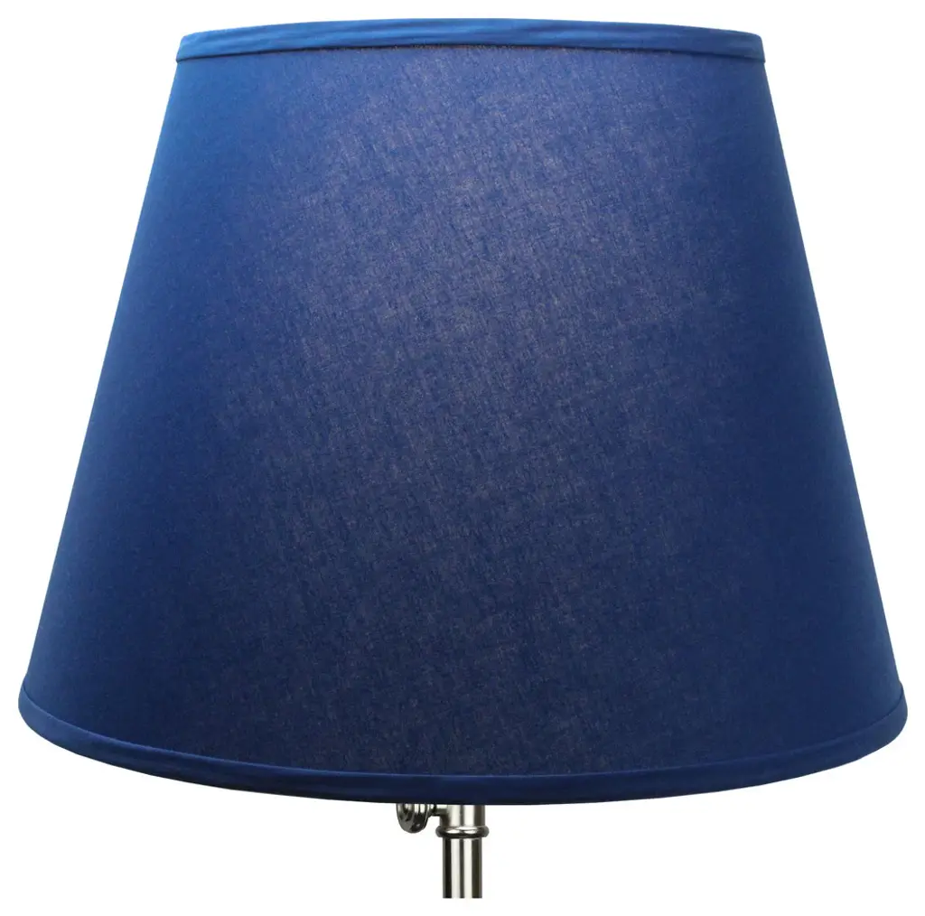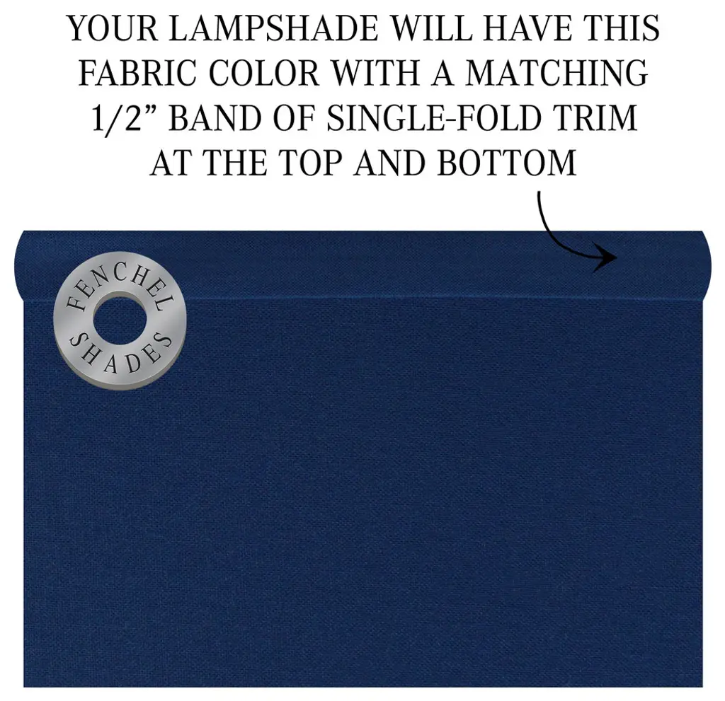 This lamp shade is made with pride in the USA, and construction does not begin until you place your order. This shade measures 11" Top Diameter x 17" Bottom Diameter x 13" Slant Height. The shade is equipped with a Nickel Finish Washer fitter. This is the most common fitter type. It consists of a small washer with an inner diameter hole size of approximately 1/2". The washer generally rests on the top of a metal harp above the light bulb and is held in place by a screw-on finial. The outside of the lamp shade has a fabric covering. The inside is a white styrene (white plastic). The top and bottom of this item is adorned with a 1/2" band of single fold lampshade trim. The trim is the same color as the covering.