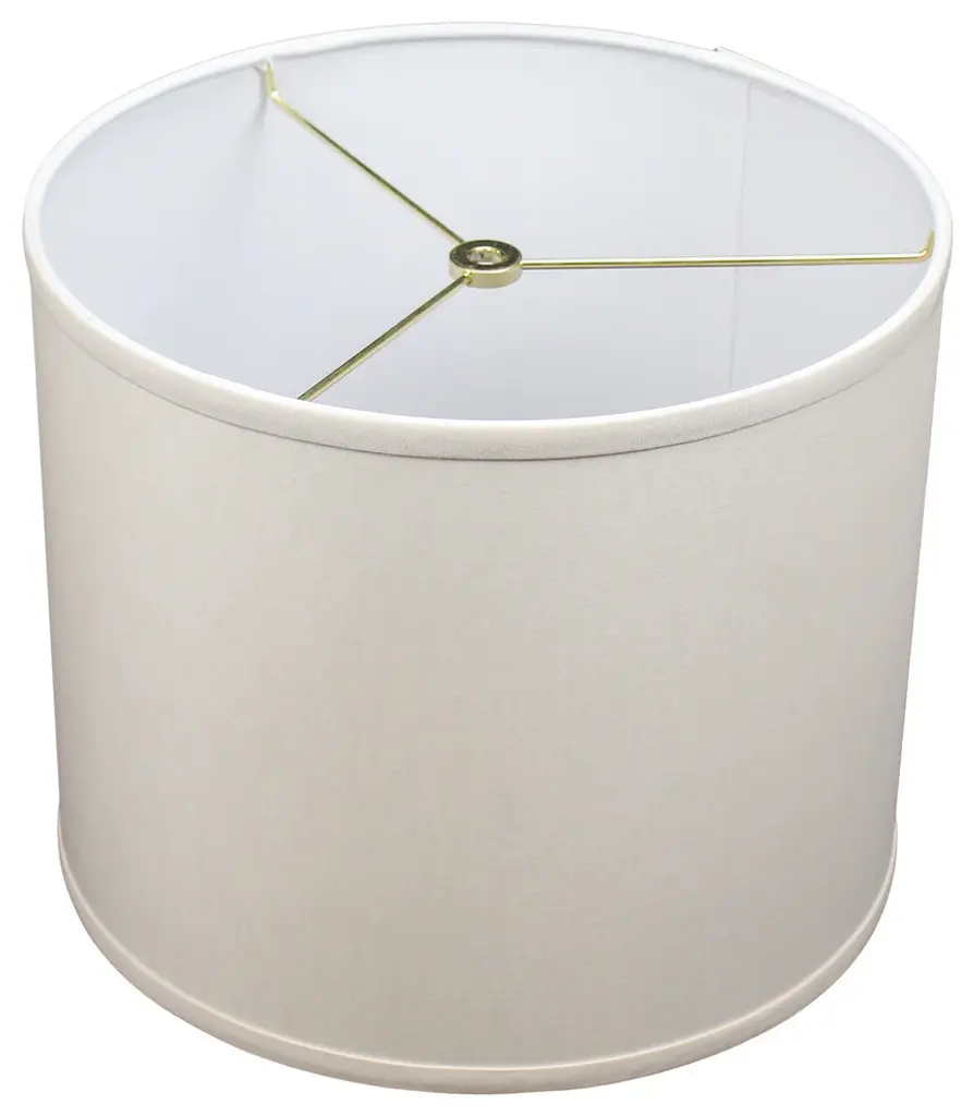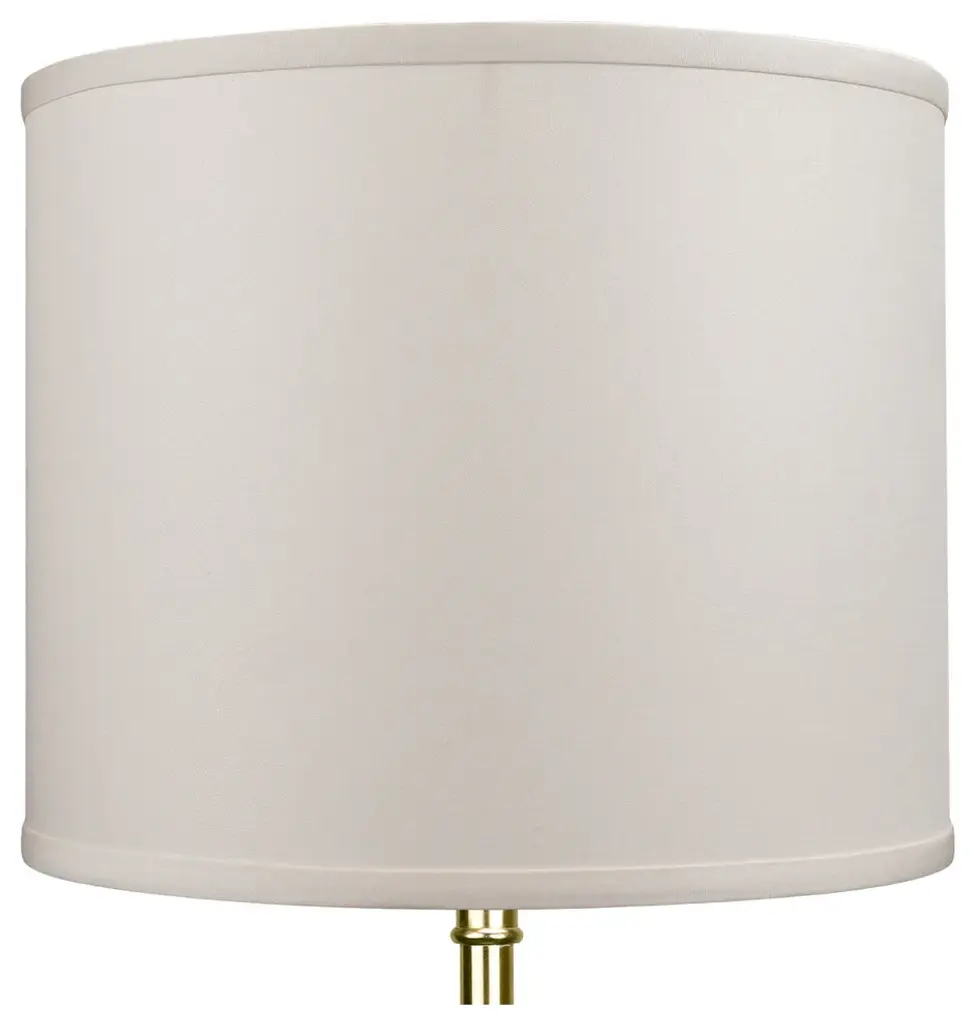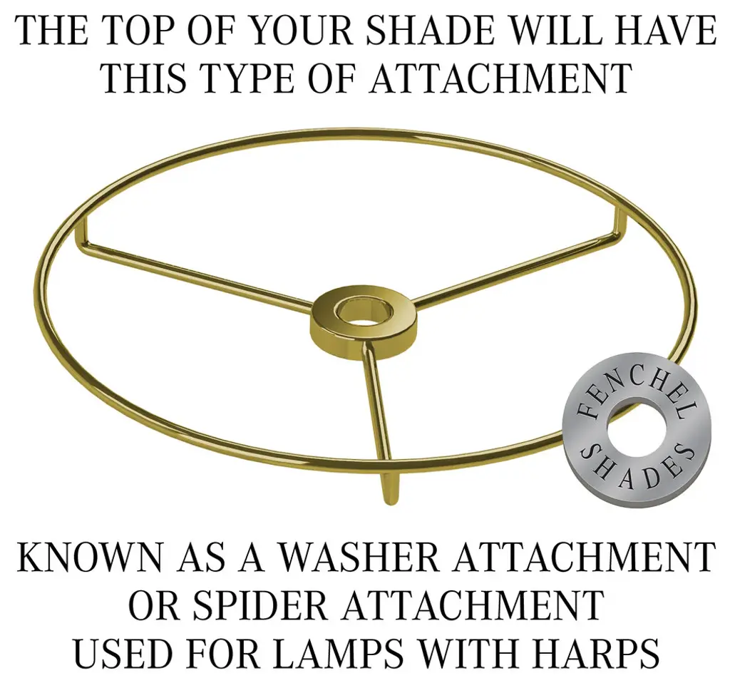 This lamp shade is made with pride in the USA, and construction does not begin until you place your order. This shade is equipped with a Brass Finish Washer fitter also known as a spider attachment. This is the most common fitter type. It consists of a small washer with an inner diameter hole size of approximately 1/2". The washer generally rests on the top of a metal harp above the light bulb and is held in place by a screw-on finial. The outside of the lamp shade has a fabric covering. The inside is a white styrene (white plastic). The top and bottom of this item is adorned with a 1/2" band of single fold lampshade trim. The trim is the same color as the covering.