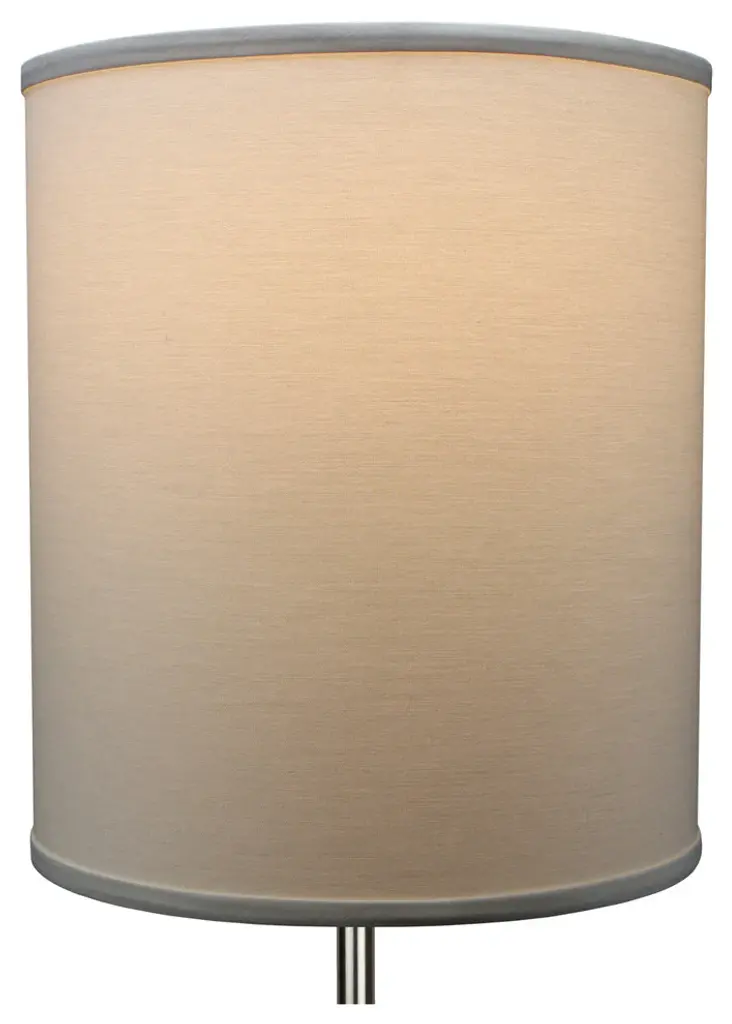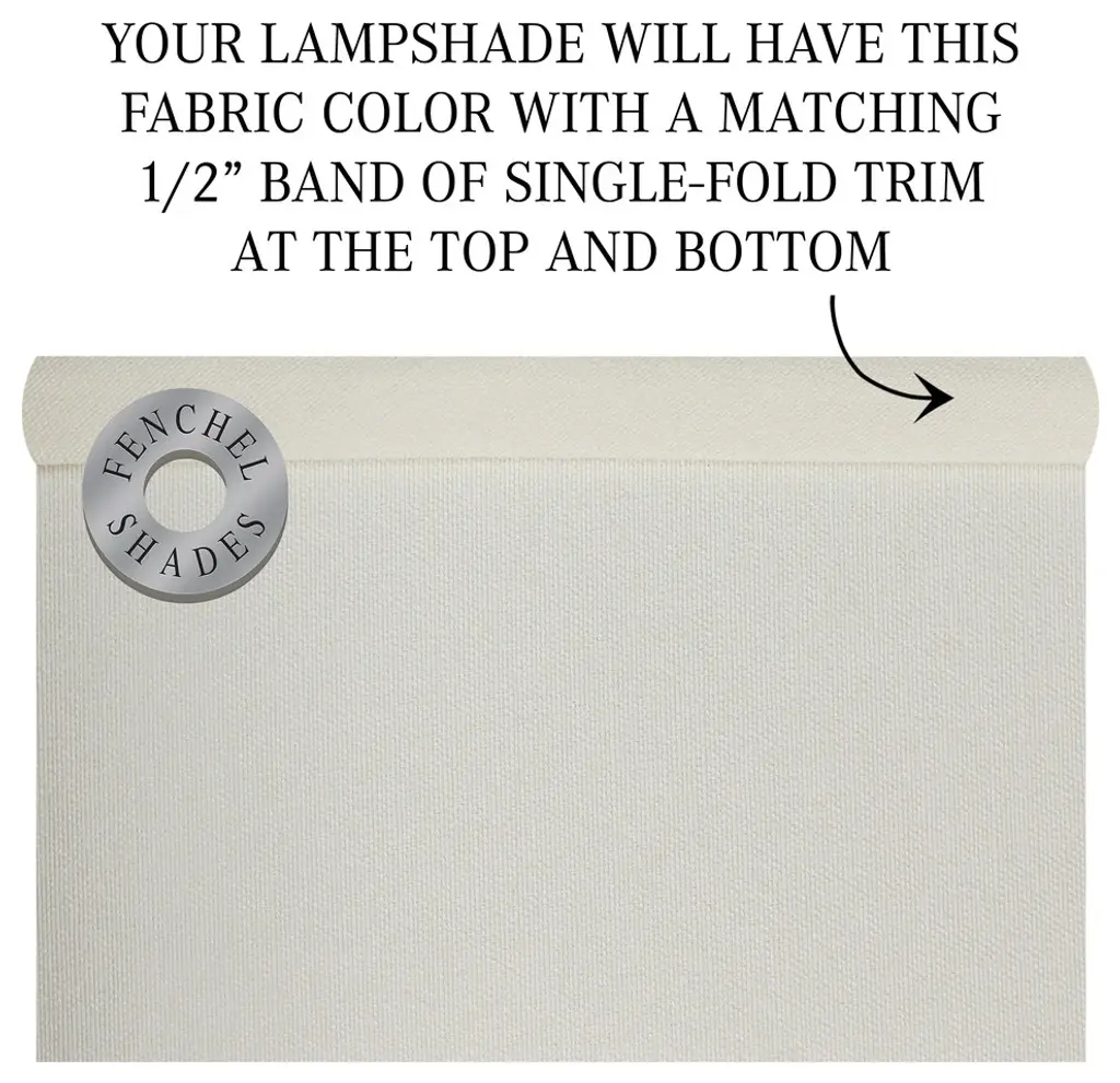 This lamp shade is made with pride in the USA, and construction does not begin until you place your order. This shade measures 12" Top Diameter x 12" Bottom Diameter x 14" Height. This shade is equipped with a nickel finish washer fitter. This is the most common fitter type. It consists of a small washer with an inner diameter hole size of approximately 1/2". The washer generally rests on the top of a metal harp above the light bulb and is held in place by a screw-on finial. The outside of the lamp shade has a fabric covering. The inside is a white styrene (white plastic). The top and bottom of this item is adorned with a 1/2" band of single fold lampshade trim. The trim is the same color as the covering.
