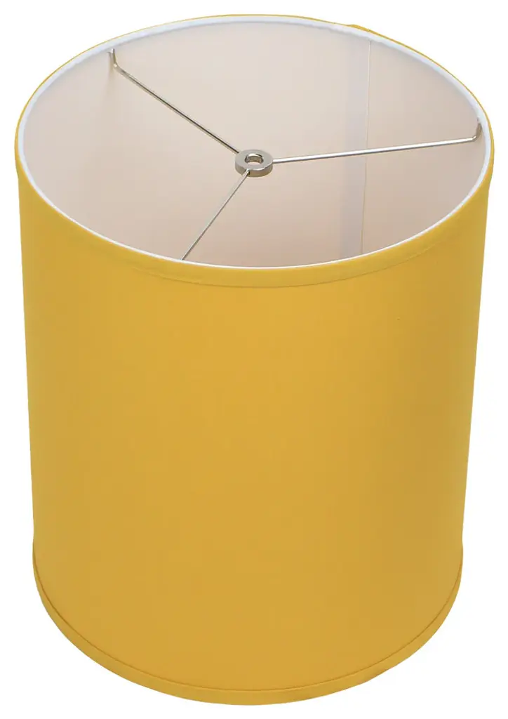 This lamp shade is made with pride in the USA, and construction does not begin until you place your order. This shade measures 12" Top Diameter x 12" Bottom Diameter x 14" Height. This shade is equipped with a nickel finish washer fitter. This is the most common fitter type. It consists of a small washer with an inner diameter hole size of approximately 1/2". The washer generally rests on the top of a metal harp above the light bulb and is held in place by a screw-on finial. The outside of the lamp shade has a fabric covering. The inside is a white styrene (white plastic). The top and bottom of this item is adorned with a 1/2" band of single fold lampshade trim. The trim is the same color as the covering.