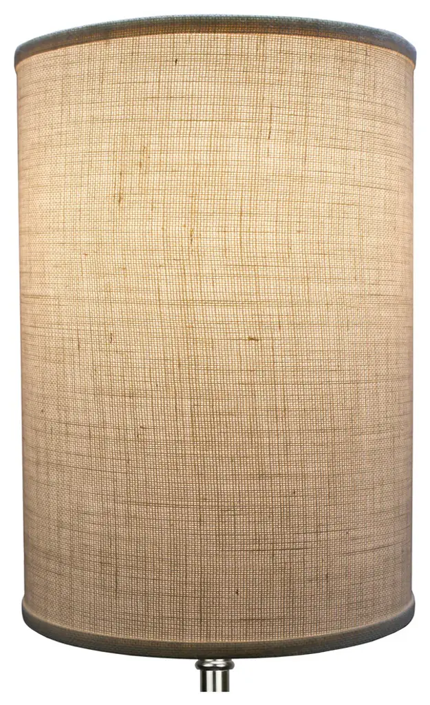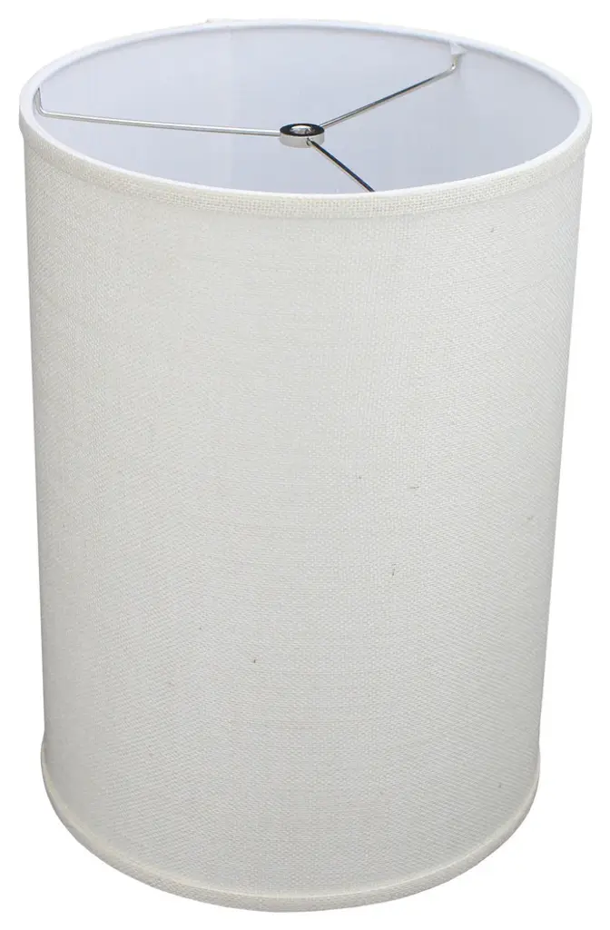 This lamp shade is made with pride in the USA, and construction does not begin until you place your order. This shade is equipped with a nickel finish washer fitter. This is the most common fitter type. It consists of a small washer with an inner diameter hole size of approximately 1/2". The washer generally rests on the top of a metal harp above the light bulb and is held in place by a screw-on finial. The outside of the lamp shade is a textured burlap fabric covering. The inside is a white styrene (white plastic). The top and bottom of this item is adorned with a 1/2" band of single fold lampshade trim. The trim is the same color as the covering.