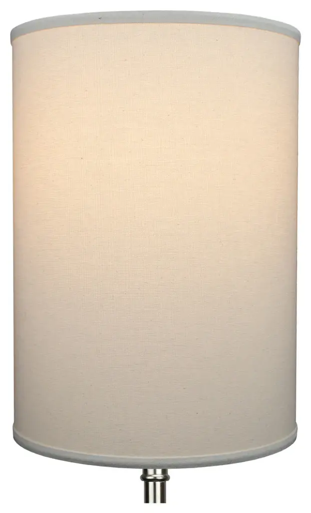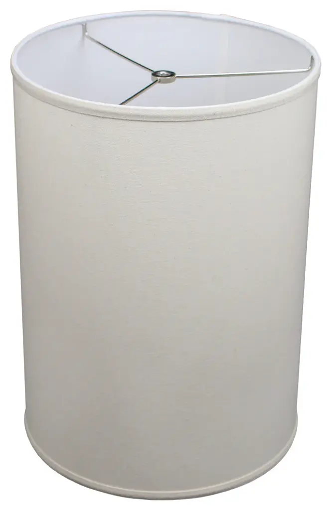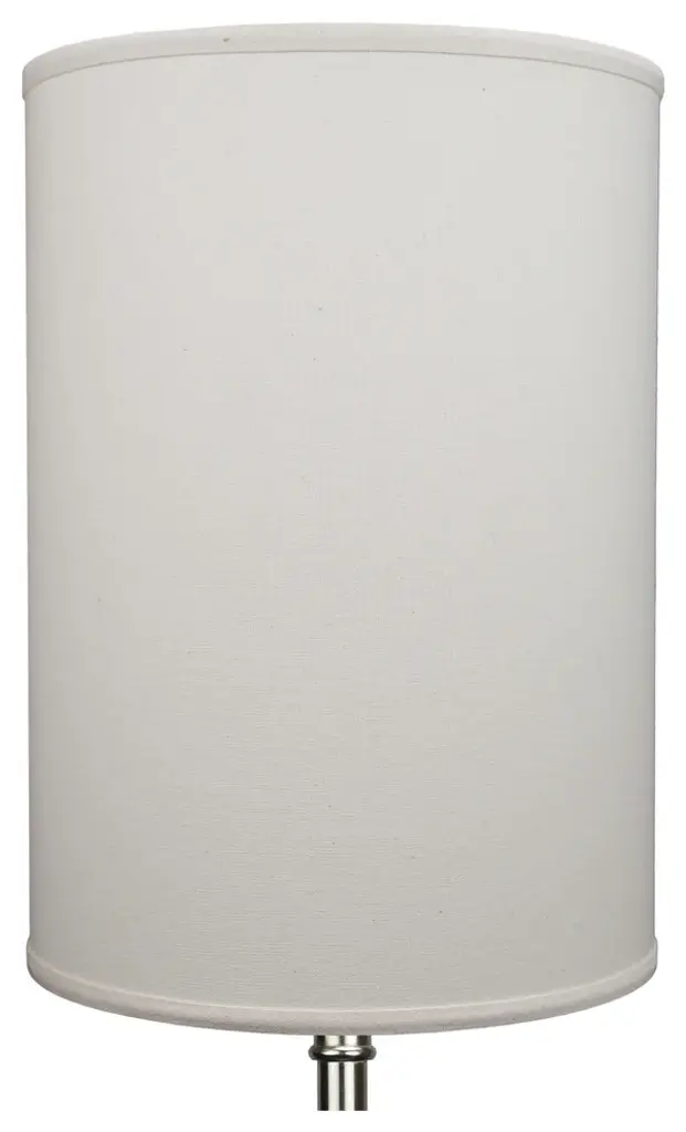 This lamp shade is made with pride in the USA, and construction does not begin until you place your order. This shade is equipped with a nickel finish washer fitter. This is the most common fitter type. It consists of a small washer with an inner diameter hole size of approximately 1/2". The washer generally rests on the top of a metal harp above the light bulb and is held in place by a screw-on finial. The outside of the lamp shade is a linen fabric covering. The inside is a white styrene (white plastic). The top and bottom of this item is adorned with a 1/2" band of single fold lampshade trim. The trim is the same color as the covering.