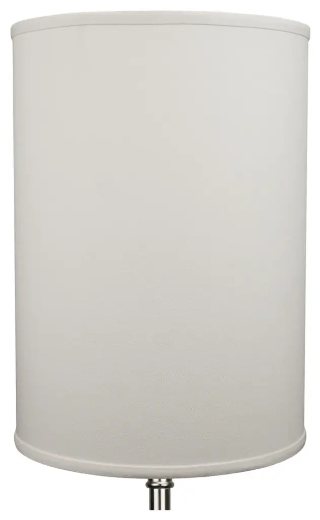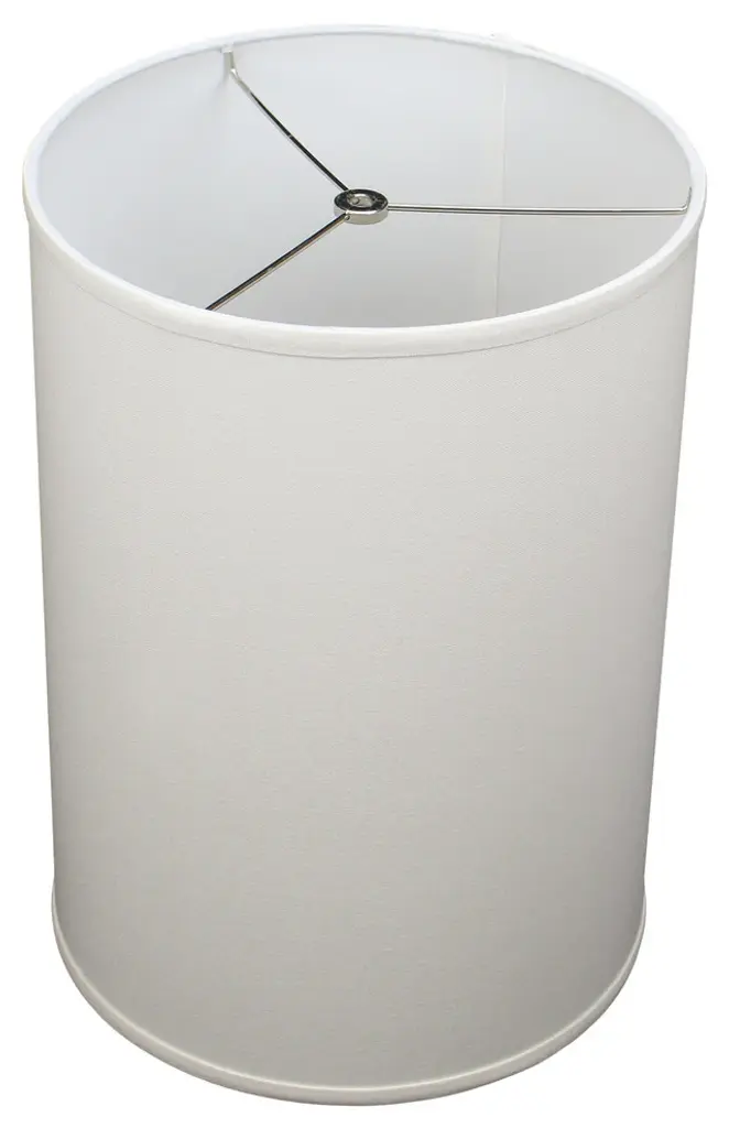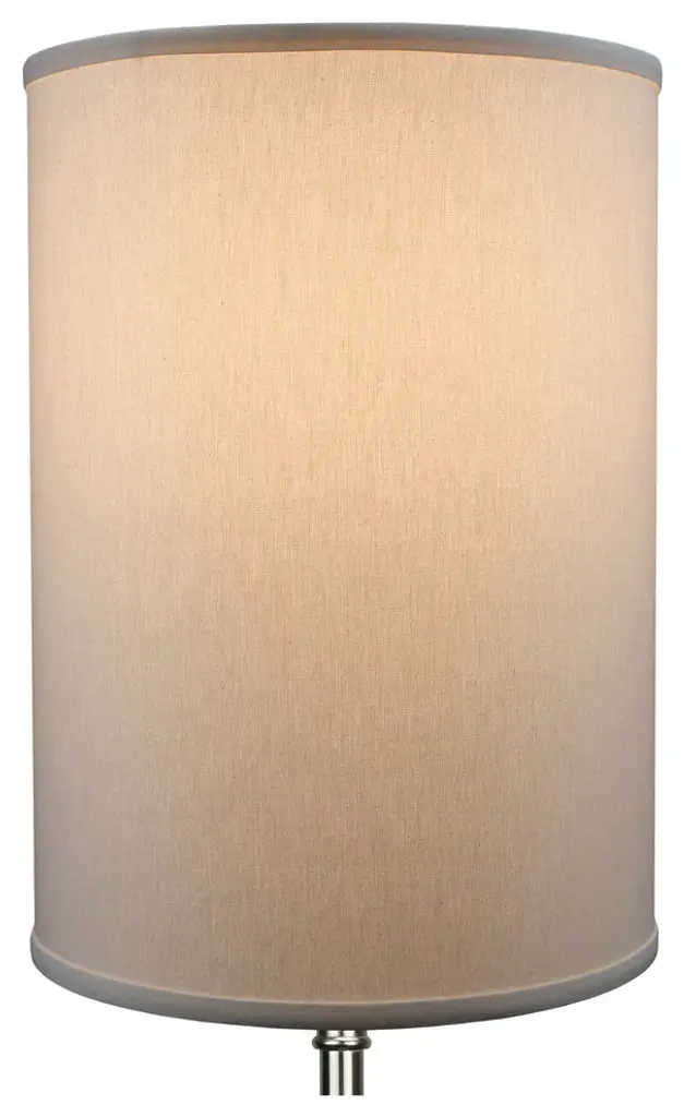 This lamp shade is made with pride in the USA, and construction does not begin until you place your order. This shade is equipped with a nickel finish washer fitter. This is the most common fitter type. It consists of a small washer with an inner diameter hole size of approximately 1/2". The washer generally rests on the top of a metal harp above the light bulb and is held in place by a screw-on finial. The outside of the lamp shade is a linen fabric covering. The inside is a white styrene (white plastic). The top and bottom of this item is adorned with a 1/2" band of single fold lampshade trim. The trim is the same color as the covering.