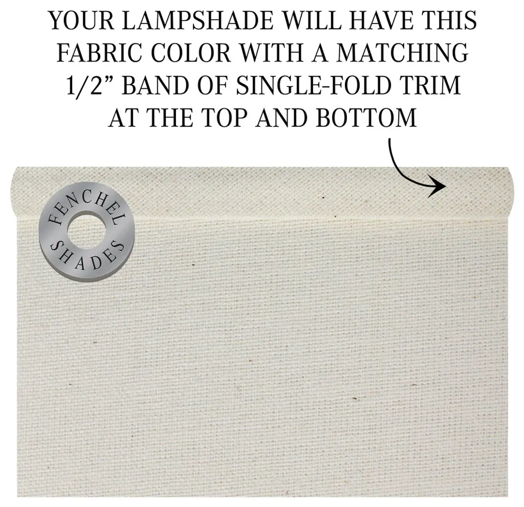 This Fenchel Shades lamp shade has a top diameter of 12 inches, a bottom diameter of 12 inches, and a slant height of 9.5 inches. The vertical height of this shade is about 9.5 inches. This attachment is called a washer attachment and is nickel in color. It is also known as a spider attachment. If your lamp has a harp, then you will generally need a washer attachment. The hole size (inner-dimension) of a washer attachment measures slightly under 1/2 inch. The drop on this particular attachment is 1/2 inch. That means, it recesses about 1/2 inch below the top of the lamp shade. This Product is proudly made in the USA with US materials.