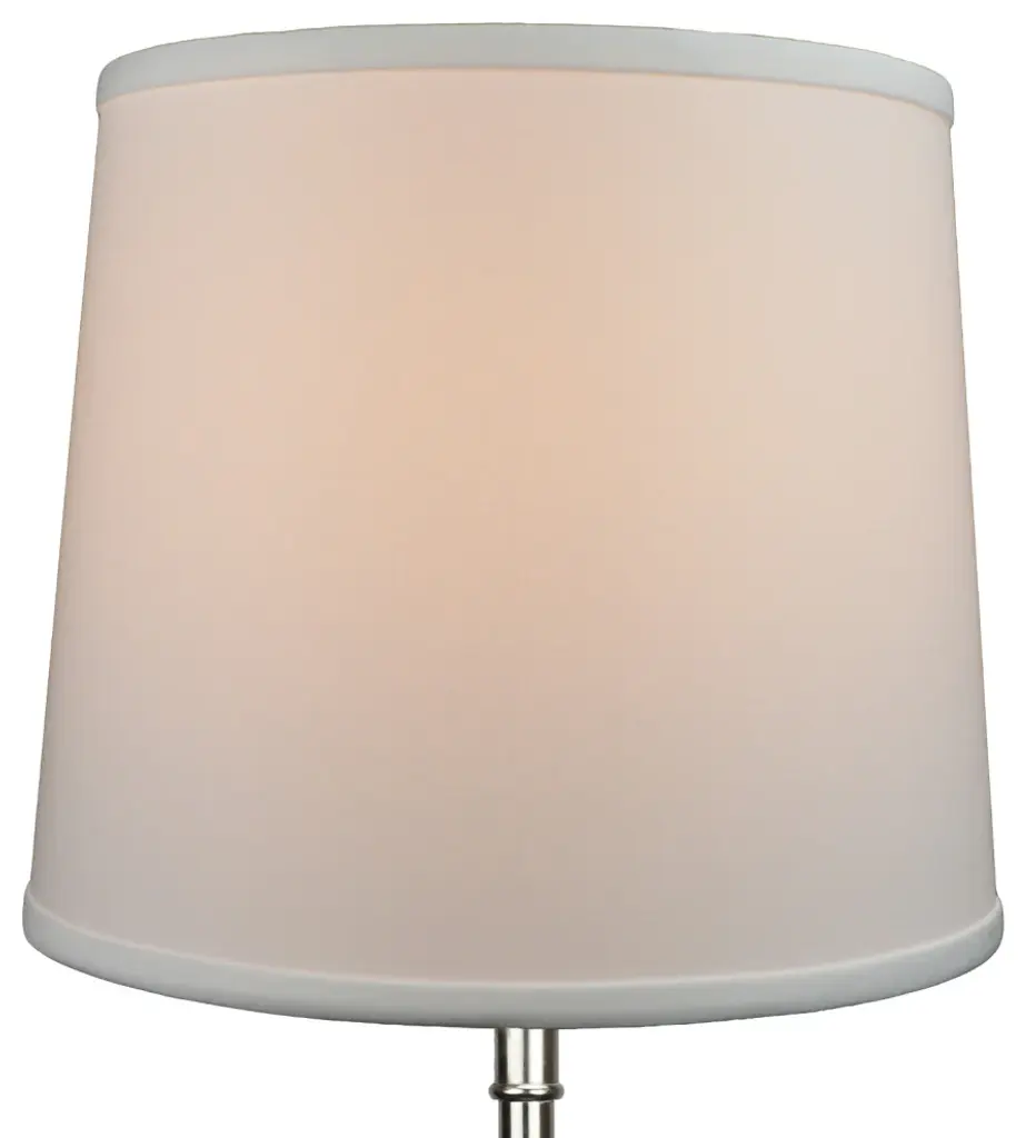 This Fenchel Shades lamp shade has a top diameter of 12 inches, a bottom diameter of 14 inches, and a slant height of 12 inches. The vertical height of this shade is about 12 inches. This attachment is called a washer attachment and is nickel in color. It is also known as a spider attachment. If your lamp has a harp, then you will generally need a washer attachment. The hole size (inner-dimension) of a washer attachment measures slightly under 1/2 inch. The drop on this particular attachment is 1/2 inch. That means, it recesses about 1/2 inch below the top of the lamp shade. This Product is proudly made in the USA with US materials.• Please note the COLOR of this shade is represented in the color swatch picture•