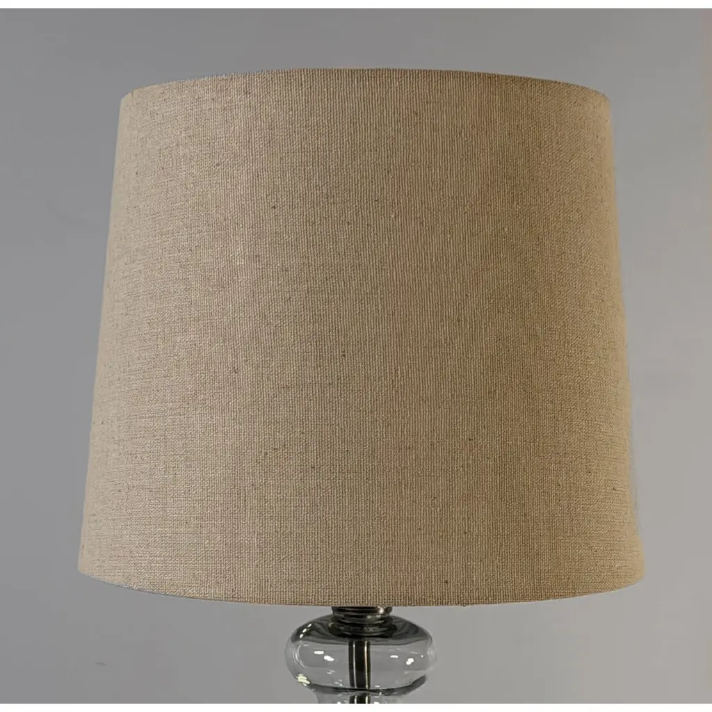This lamp shade is made with pride in the USA, and construction does not begin until you place your order. This shade measures 13" Top Diameter x 15" Bottom Diameter x 10" Slant Height. The shade is equipped with a Nickel Finish Washer fitter. This is the most common fitter type. It consists of a small washer with an inner diameter hole size of approximately 1/2". The washer generally rests on the top of a metal harp above the light bulb and is held in place by a screw-on finial. The outside of the lamp shade has a fabric covering. The inside is a white styrene (white plastic). The top and bottom of this item is adorned with a 1/2" band of single fold lampshade trim. The trim is the same color as the covering.