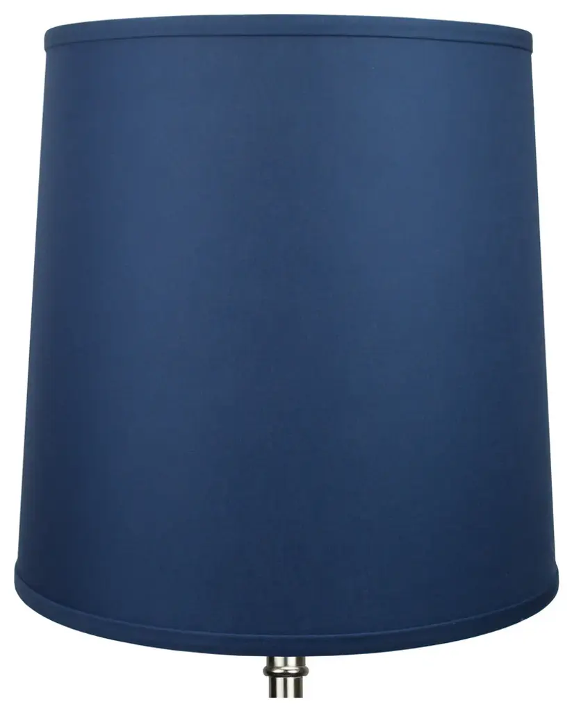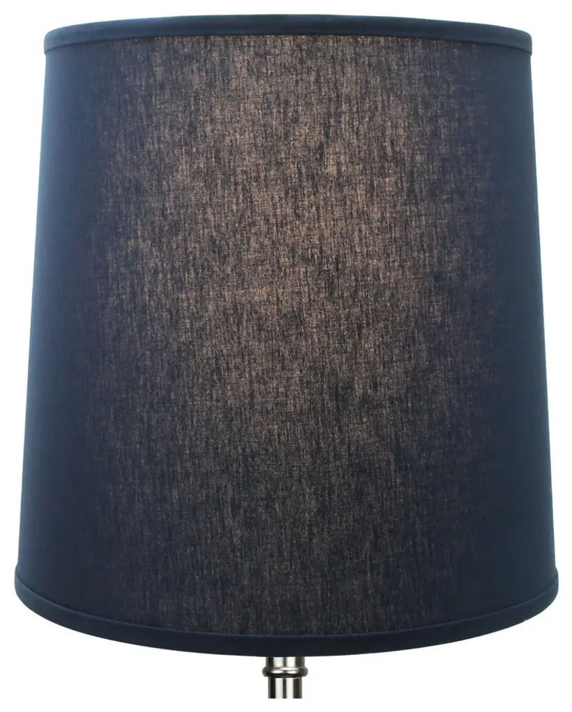 This lamp shade is made with pride in the USA, and construction does not begin until you place your order. This shade measures 13" Top Diameter x 15" Bottom Diameter x 15" Slant Height. This shade is equipped with a nickel finish washer fitter. This is the most common fitter type. It consists of a small washer with an inner diameter hole size of approximately 1/2". The washer generally rests on the top of a metal harp above the light bulb and is held in place by a screw-on finial. The outside of the lamp shade has a fabric covering. The inside is a white styrene (white plastic). The top and bottom of this item is adorned with a 1/2" band of single fold lampshade trim. The trim is the same color as the covering.