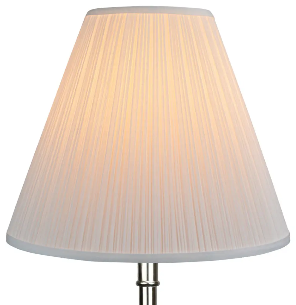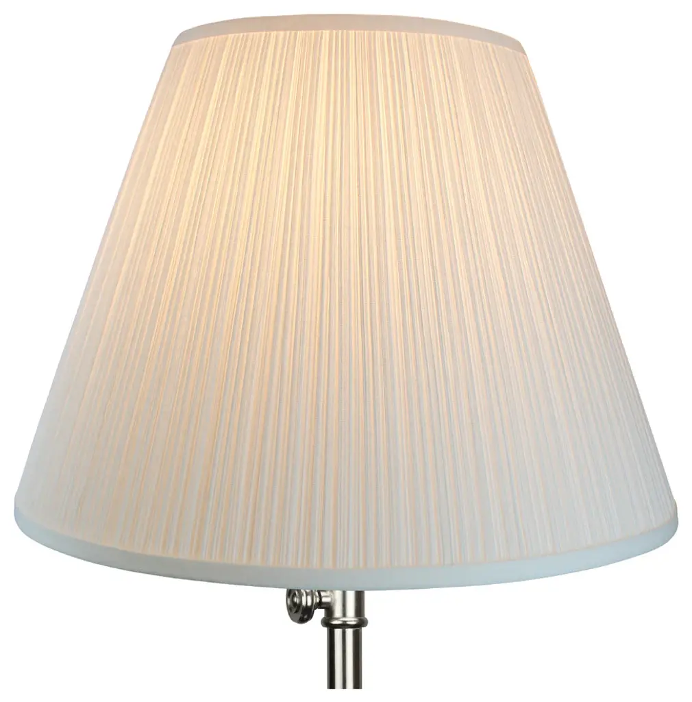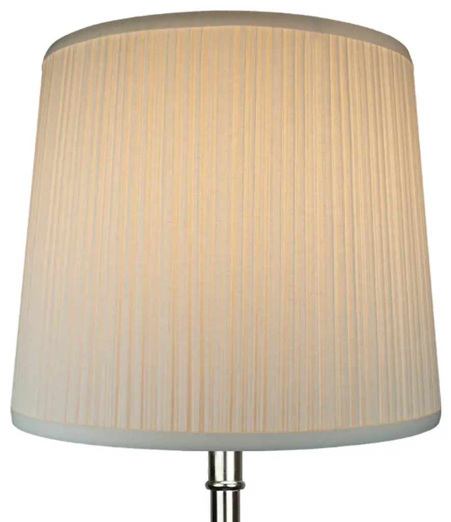 This lamp shade is made with pride in the USA, and construction does not begin until you place your order. This shade measures 13" Top Diameter x 15" Bottom Diameter x 15" Slant Height. This shade is equipped with a nickel finish washer fitter. This is the most common fitter type. It consists of a small washer with an inner diameter hole size of approximately 1/2". The washer generally rests on the top of a metal harp above the light bulb and is held in place by a screw-on finial. The outside of the lamp shade has a fabric covering. The inside is a white styrene (white plastic). The top and bottom of this item is adorned with a 1/2" band of single fold lampshade trim. The trim is the same color as the covering.