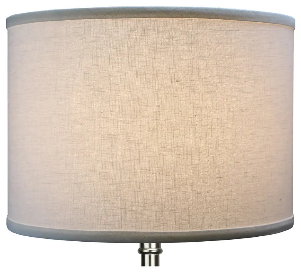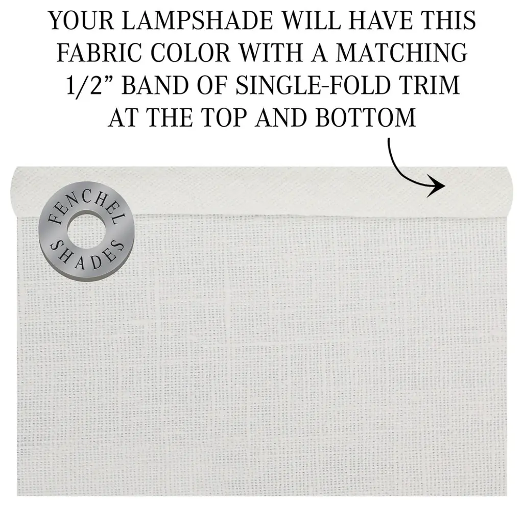 This lamp shade is made with pride in the USA, and construction does not begin until you place your order. This shade is equipped with a Nickel Finish Washer fitter. This is the most common fitter type. It consists of a small washer with an inner diameter hole size of approximately 1/2". The washer generally rests on the top of a metal harp above the light bulb and is held in place by a screw-on finial. The outside of the lamp shade has a fabric covering. The inside is a white styrene (white plastic). The top and bottom of this item is adorned with a 1/2" band of single fold lampshade trim. The trim is the same color as the covering.