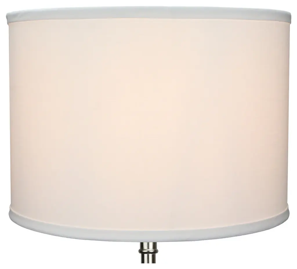 This lamp shade is made with pride in the USA, and construction does not begin until you place your order. This shade is equipped with a Nickel Finish Washer fitter. This is the most common fitter type. It consists of a small washer with an inner diameter hole size of approximately 1/2". The washer generally rests on the top of a metal harp above the light bulb and is held in place by a screw-on finial. The outside of the lamp shade has a fabric covering. The inside is a white styrene (white plastic). The top and bottom of this item is adorned with a 1/2" band of single fold lampshade trim. The trim is the same color as the covering.