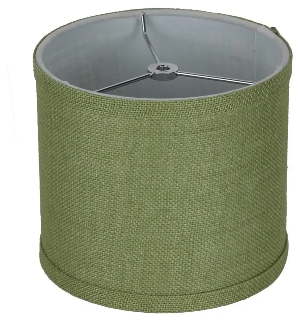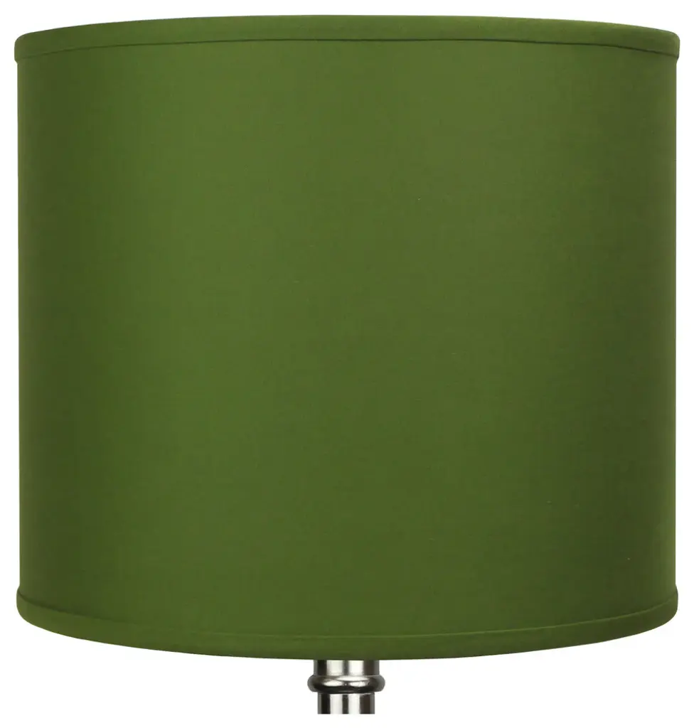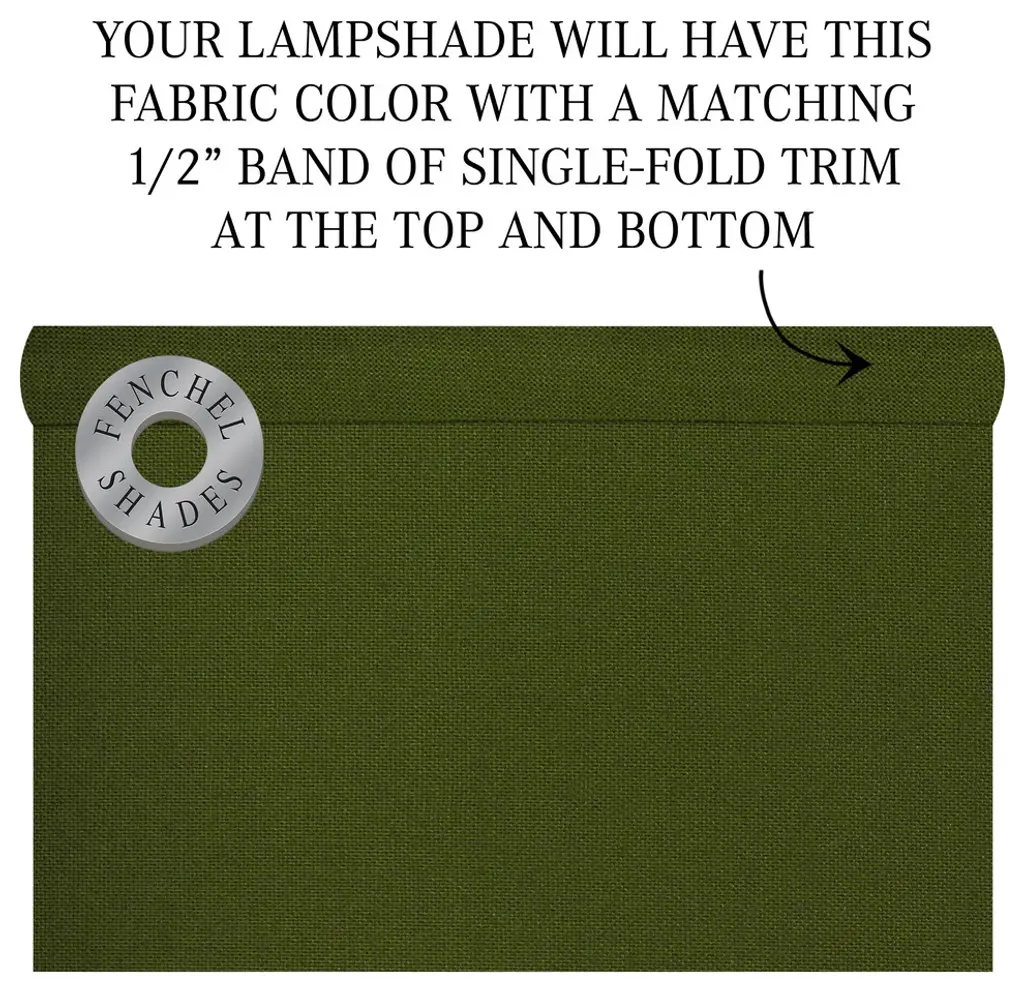 This lamp shade is made with pride in the USA, and construction does not begin until you place your order. This shade measures 14" Top Diameter x 14" Bottom Diameter x 12" Height. This shade is equipped with a nickel finish washer fitter. This is the most common fitter type. It consists of a small washer with an inner diameter hole size of approximately 1/2". The washer generally rests on the top of a metal harp above the light bulb and is held in place by a screw-on finial. The outside of the lamp shade has a fabric covering. The inside is a white styrene (white plastic). The top and bottom of this item is adorned with a 1/2" band of single fold lampshade trim. The trim is the same color as the covering.