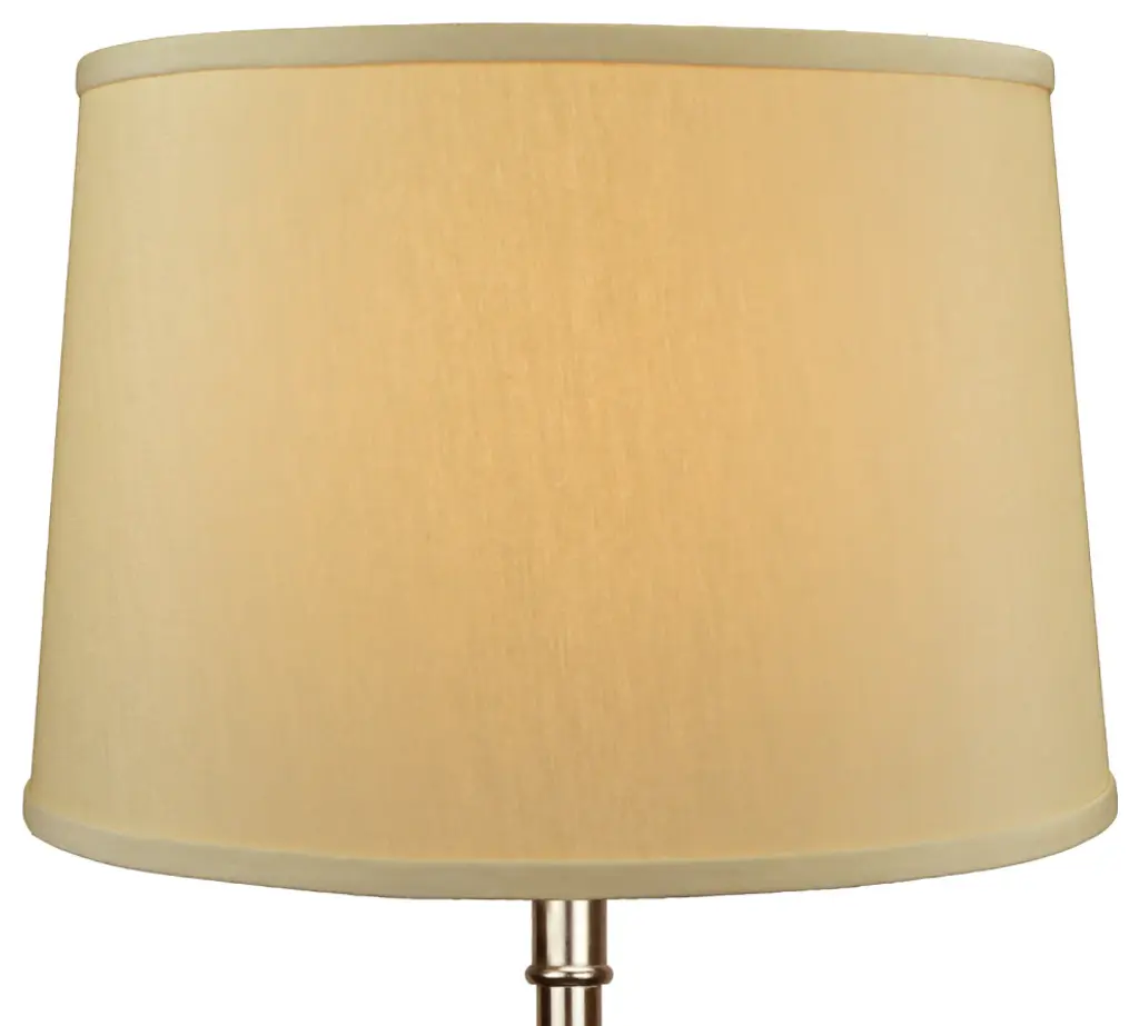 This Fenchel Shades lamp shade has a top diameter of 14 inches, a bottom diameter of 16 inches, and a slant height of 11 inches. The vertical height of this shade is about 11 inches. This attachment is called a washer attachment and is nickel in color. It is also known as a spider attachment. If your lamp has a harp, then you will generally need a washer attachment. The hole size (inner-dimension) of a washer attachment measures slightly under 1/2 inch. The drop on this particular attachment is 1/2 inch. That means, it recesses about 1/2 inch below the top of the lamp shade. This Product is proudly made in the USA with US materials.