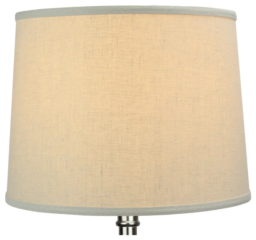 This lamp shade is made with pride in the USA, and construction does not begin until you place your order. This shade measures 14" Top Diameter x 16" Bottom Diameter x 12" Slant Height. This shade is equipped with a nickel finish washer fitter. This is the most common fitter type. It consists of a small washer with an inner diameter hole size of approximately 1/2". The washer generally rests on the top of a metal harp above the light bulb and is held in place by a screw-on finial. The outside of the lamp shade has a fabric covering. The inside is a white styrene (white plastic). The top and bottom of this item is adorned with a 1/2" band of single fold lampshade trim. The trim is the same color as the covering.
